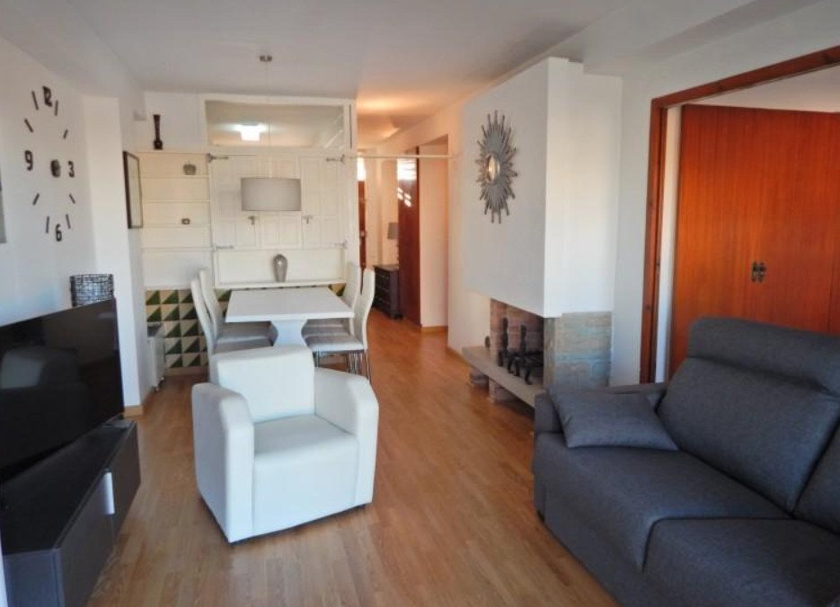 В квартире гостиная-столовая с камином, отдельная кухня, две двухместные спальни со встроенными шкафами и ванная комната. Кроме того, большая терраса. Из окон открывается красивый вид на горы. Напольное покрытие – плитка и паркет.