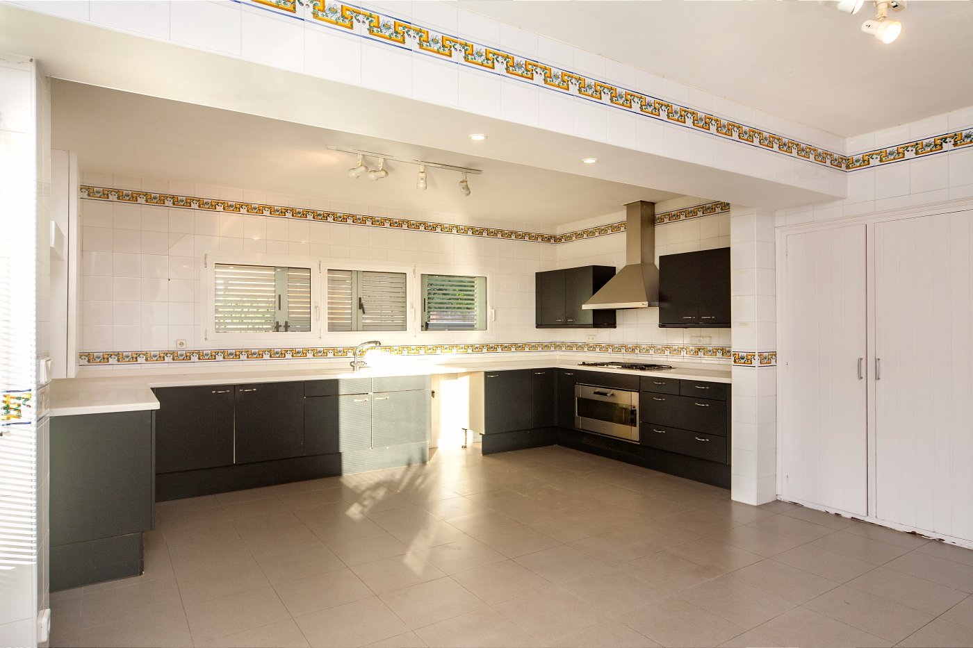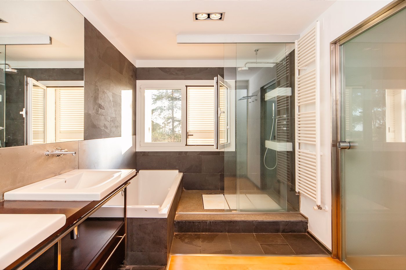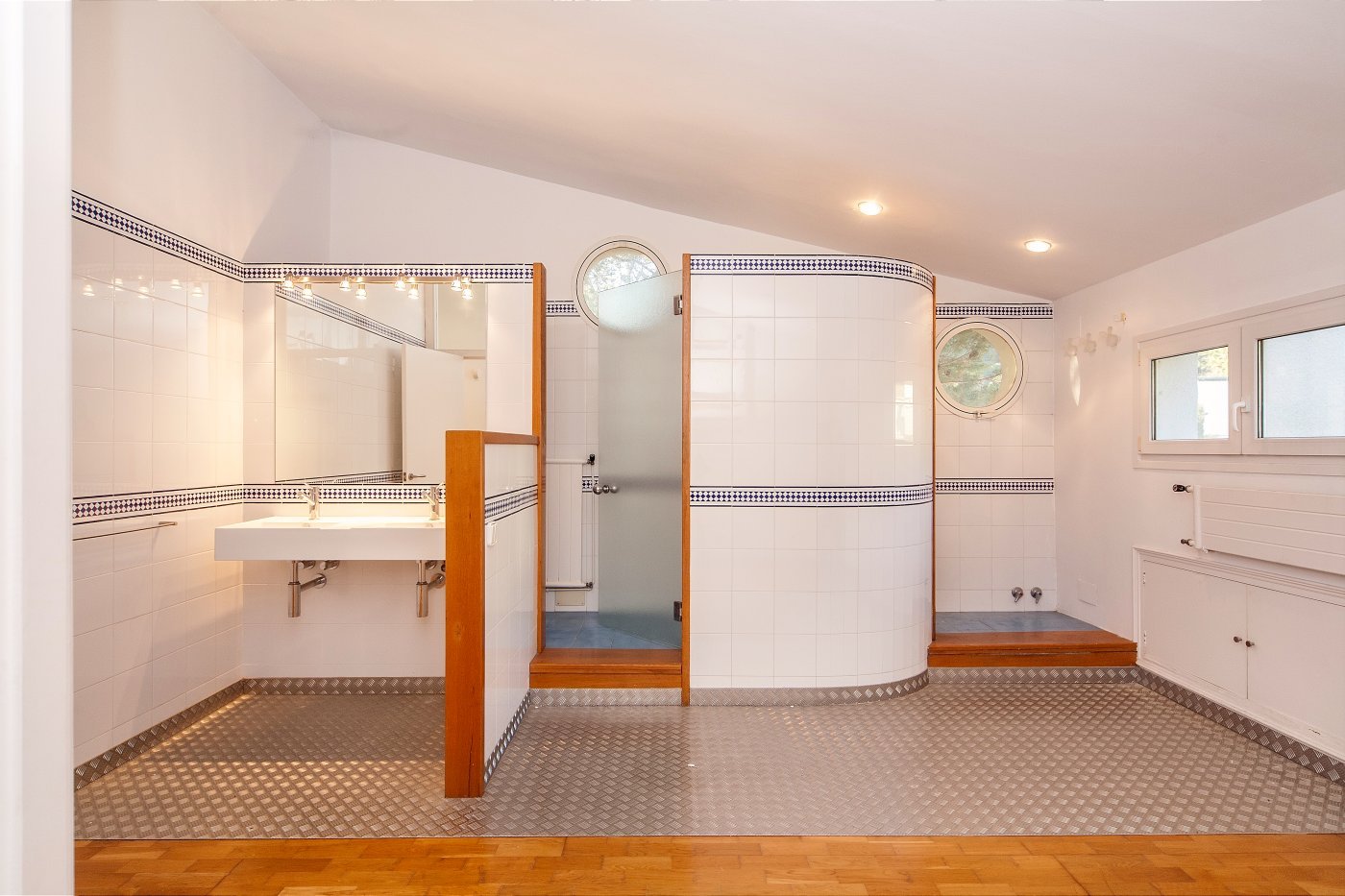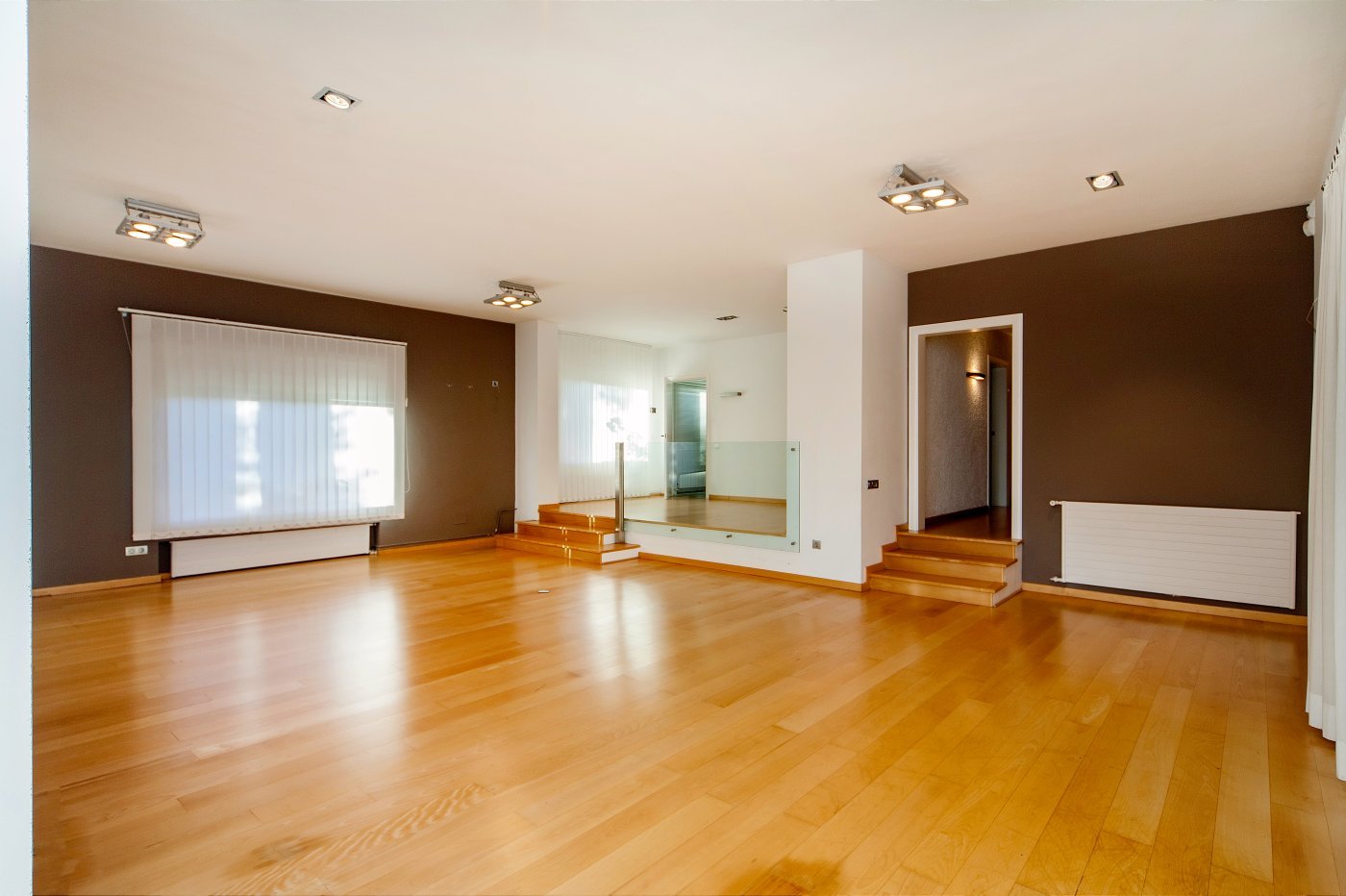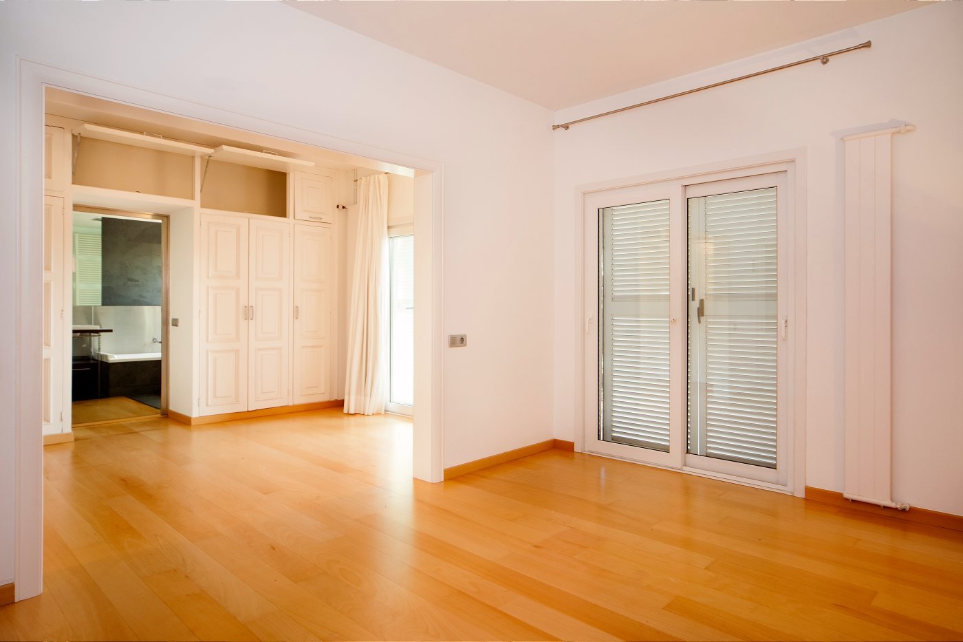 Просторный коридор, оснащённый встроенными шкафами, ведёт нас к нескольким спальням, главная из которых, с большой гардеробной и ванной комнатой, приятно удивляет своим размером и натуральным освещением.