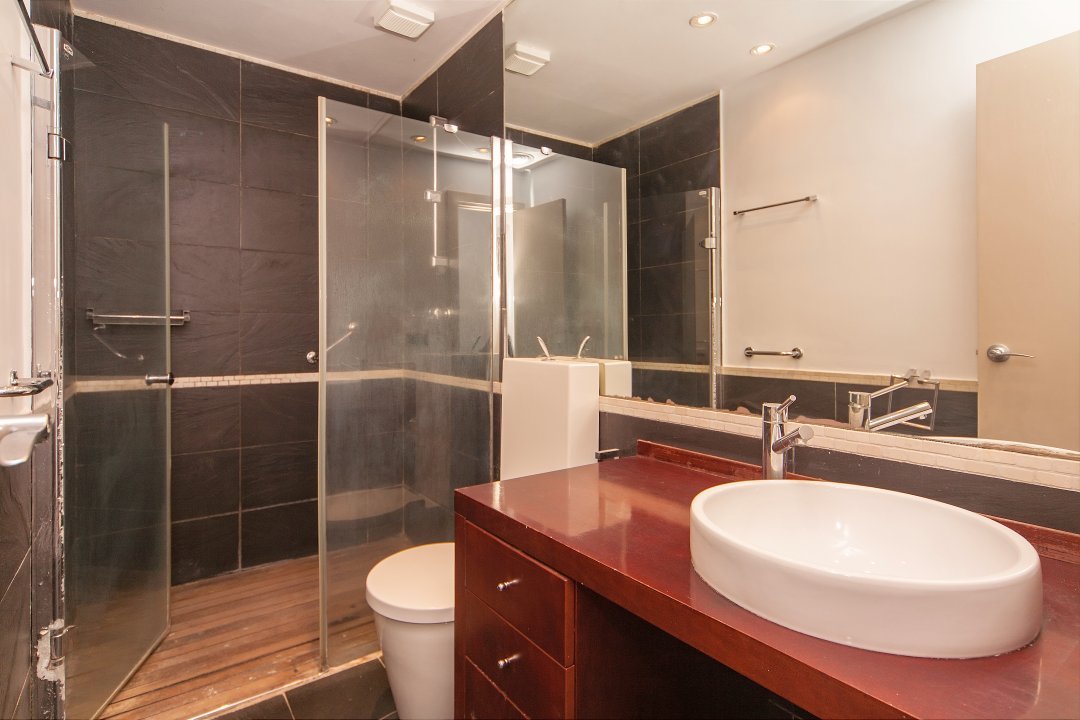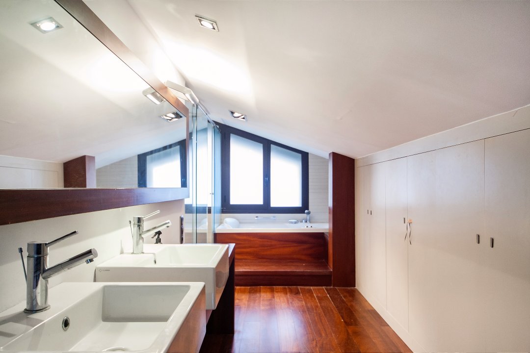 Поднявшись по винтовой лестнице на этаж выше, мы оказываемся на мансарде, в комнату типа люкс с просторной ванной комнатой и встроенными шкафами. Мансарда может служить комнатой для гостей благодаря своей автономии и уединению.