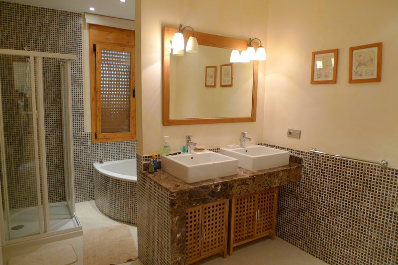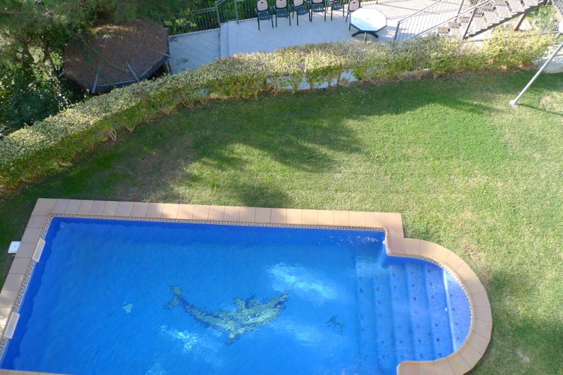 В доме отдельная полностью оборудованная кухня, гостиная, 3 спальни, в каждой из которых имеется двуспальная кровать. Также в доме 3 ванные комнаты, гостевой туалет. Рядом с домом разбит сад с бассейном.