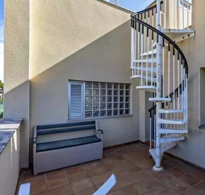 На террасе винтовая лестница, которая ведет на большую частную террасу с прекрасным видом.