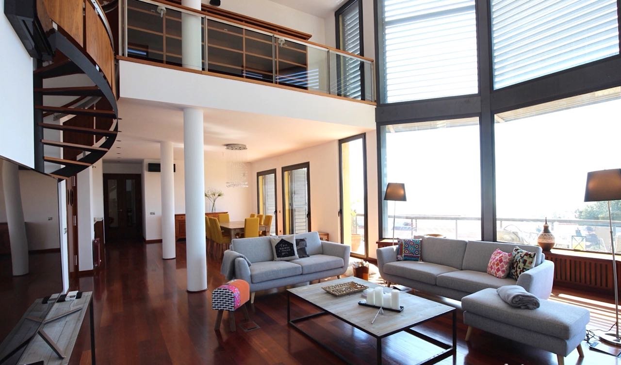 Это красивое место предлагает обеденный стол с местами для 8 гостей на одном конце и 2 удобных дивана, журнальный столик, телевизор и звуковую систему в гостиной на противоположном конце. Зона отдыха купается в ярком средиземноморском свете из потрясающих окон высотой в два этажа, и есть прекрасный вид на море из каждого угла, а также на террасе, которая проходит по всей длине комнаты.