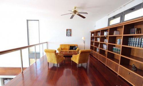 Также на этом этаже находится небольшая библиотека в стиле мезонина с диваном, 2 стульями, журнальным столиком и книжными полками. В эту зону также можно попасть прямо из гостиной/столовой на 1 этаже по впечатляющей винтовой лестнице.