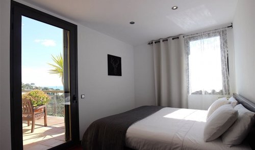 Спальная зона 1-включает в себя 2 спальни с двуспальной кроватью 160 см и двумя односпальными кроватями, которые могут быть сделаны в двуспальную 180 см, 1 Общая гардеробная, 1 ванная комната с большим умывальником, душ. Напротив спальной зоны находится гостиная, отделенная стеклянной стеной и оснащенная удобными диванами и телевизором. В этом номере есть дверь, которая выходит на заднюю террасу и теннисный корт.