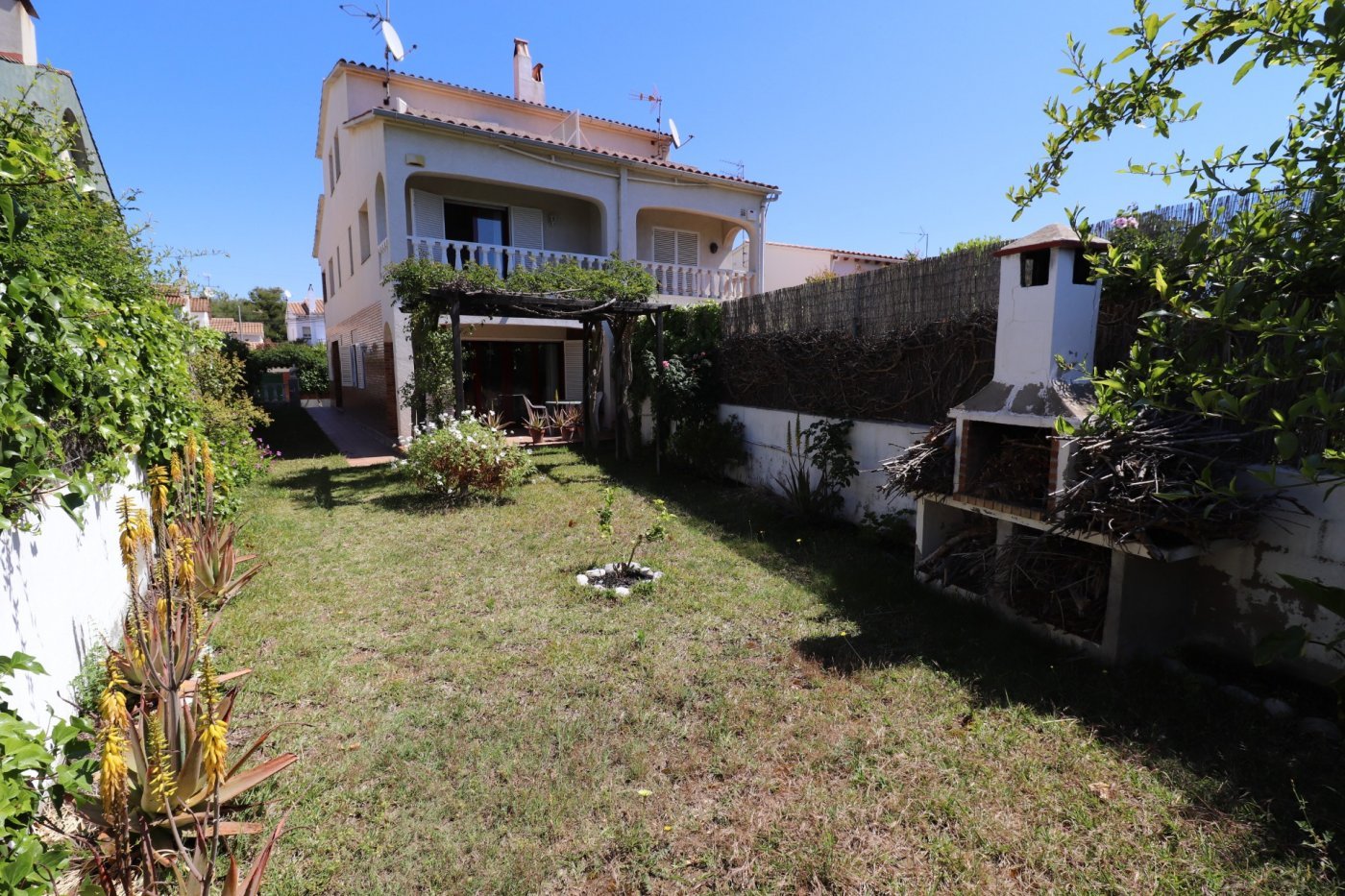В доме есть колонки, встроенные в потолок на всех уровнях, джакузи, сад 200 м2 с барбекю, наружные стены очень хорошего качества, двойной стеклопакет и др.