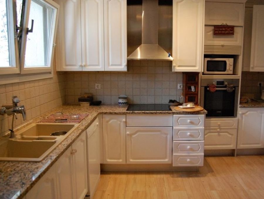 На первом этаже находится большой коридор, который проходит до другой стороны дома и обеспечивает удобное расположение комнат. Здесь же есть просторная гостиная-столовая с камином, откуда можно выйти на террасу с видом на сад и бассейн. Здесь же размещена вместительная кухня с большим количеством места для хранения всевозможной кухонной утвари. На этом же этаже есть 3 комнаты: основная с собственной ванной , большим камином, встроенными шкафами и деревянными потолками, которые придают помещению еще большего уюта. Из этой комнаты тоже можно попасть на террасу. На этаже есть туалет.