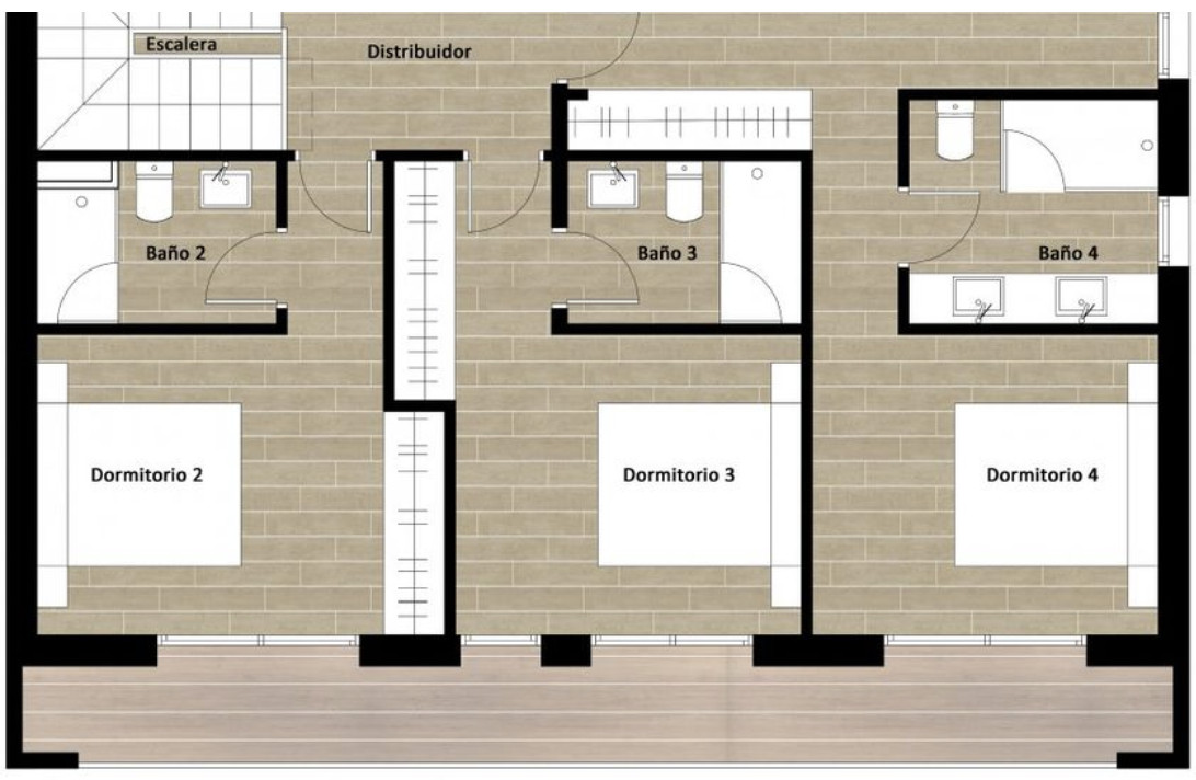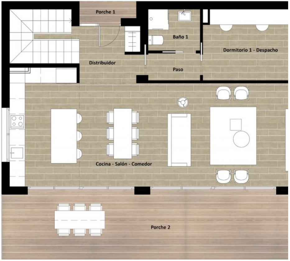 Согласно проекту, предусмотрено строительство нового двухэтажного дома. На первом этаже большой холл, который ведет в открытую гостиную-столовую с выходом в сад с верандой площадью 25 м2. Также на первом этаже будет дизайнерская американская кухня со шкафами и красивым центральным островом, чтобы максимизировать пространство и функциональность, а также комната или кабинет в 10 м2 с ванной комнатой.