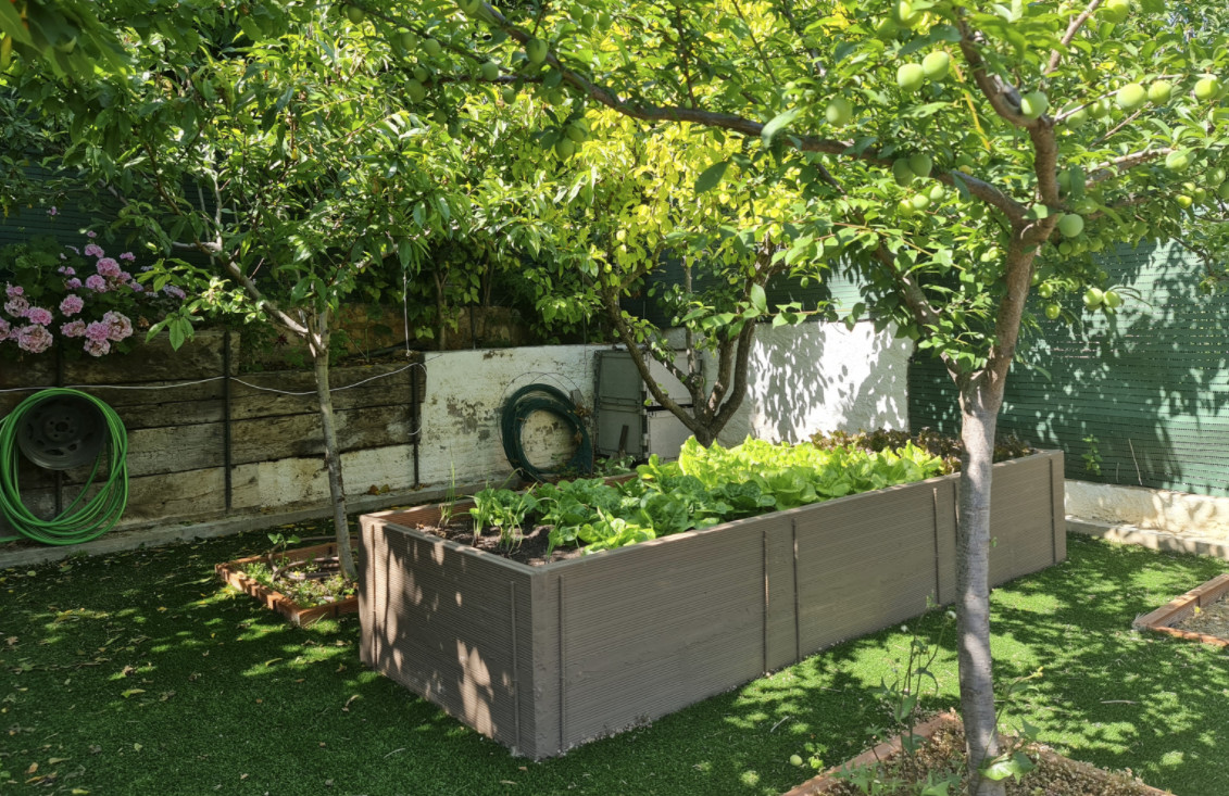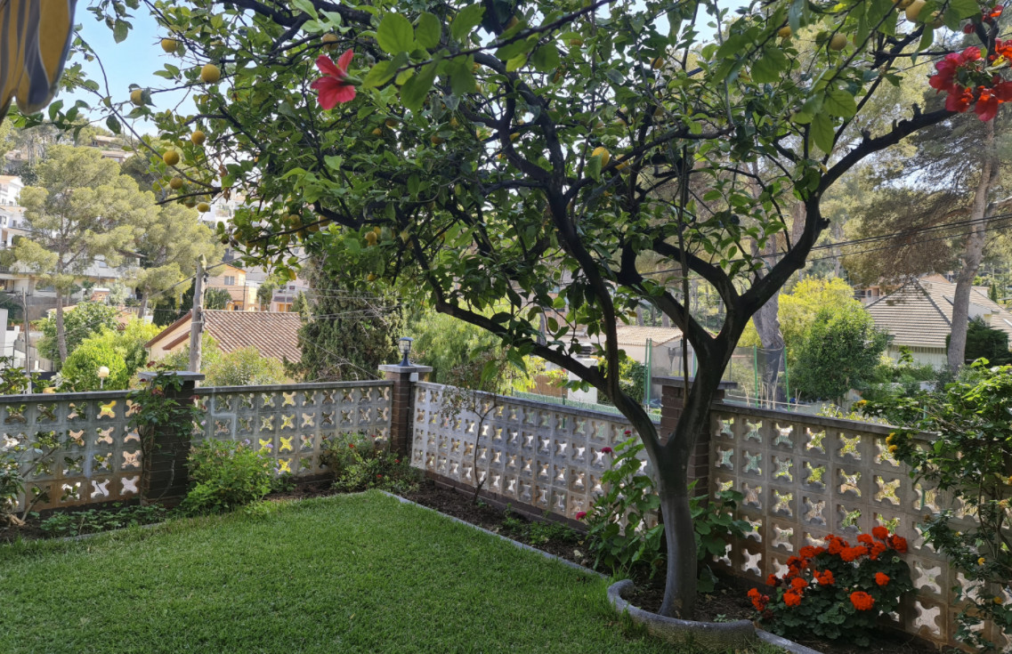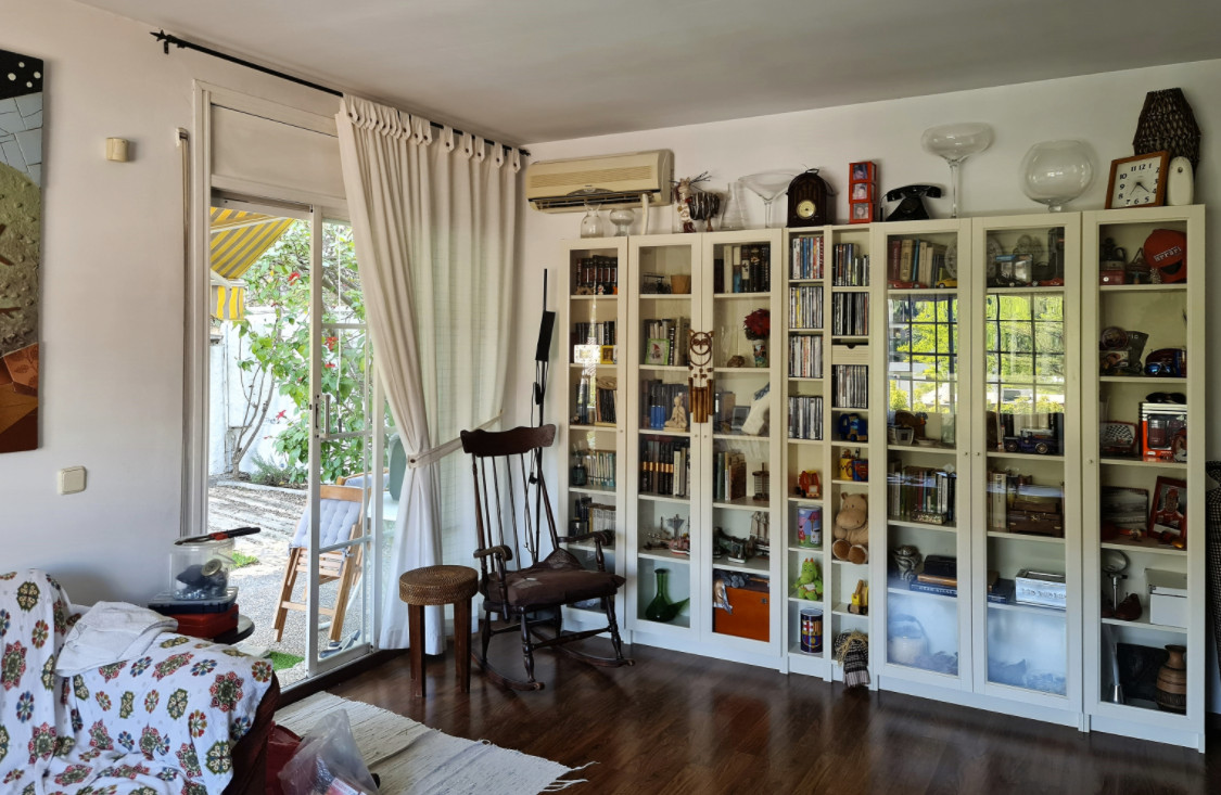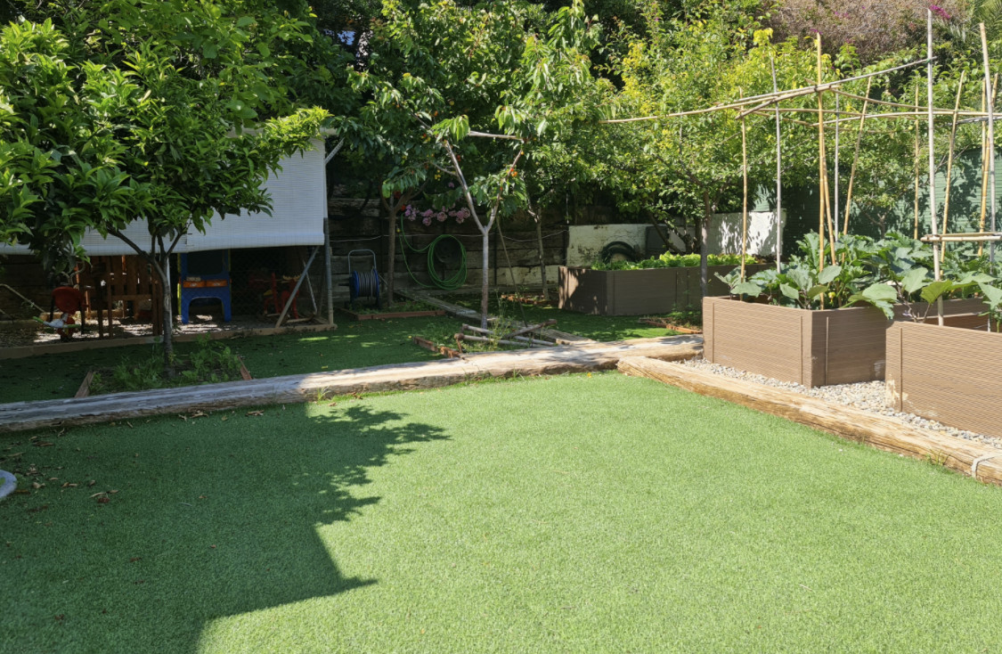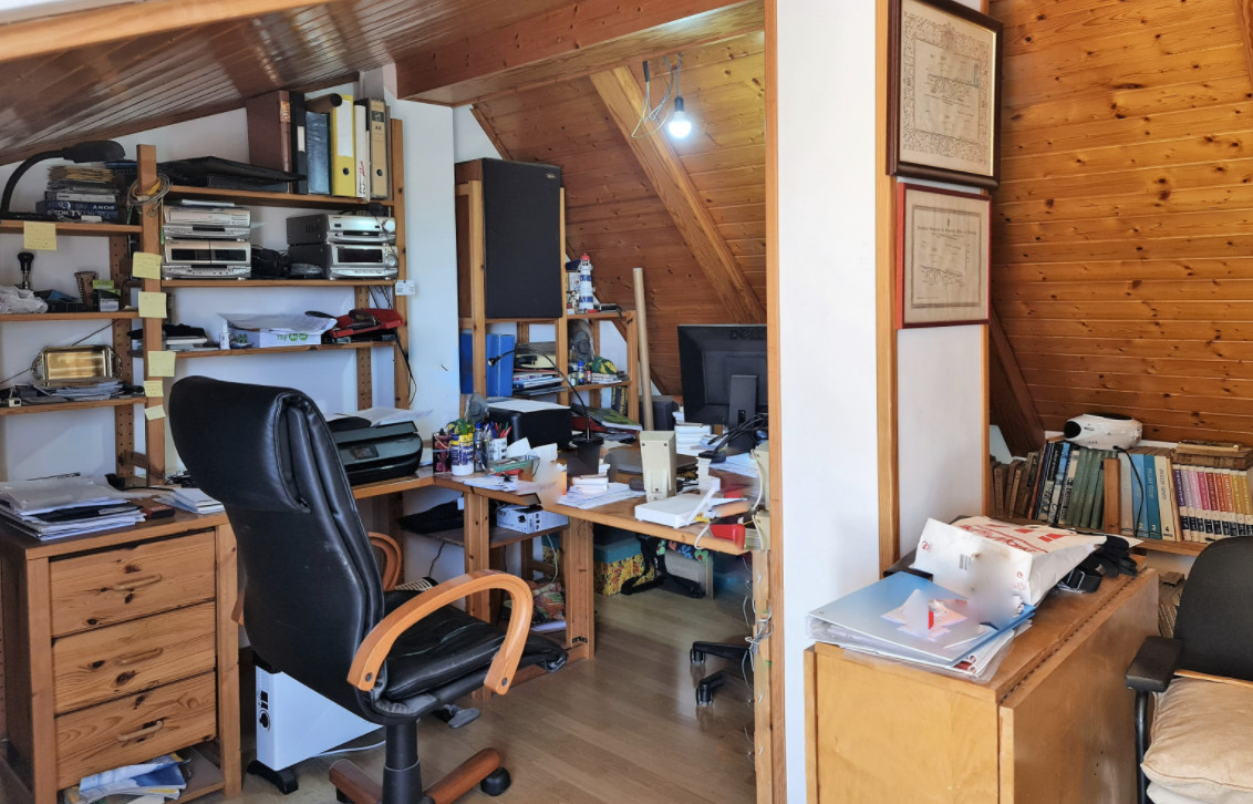 Цокольный этаж с гаражом очень просторный, на три машиноместа. Здесь также есть мастерская и большой подвал. Внутренняя лестница ведет из гаража на первый этаж, где оборудована дневная зона, также здесь гостиная, очень светлая, с прекрасным видом и с выходом в сад, поросший травой, с цветочными клумбами и красивым лимонным деревом. На этом же этаже спальня, открытая ванная комната и большая кухня со встроенной столовой, с выходом в другой очень ухоженный фруктовый сад. Здесь сразу 2 террасы, зона барбекю, кладовая и прачечная.
