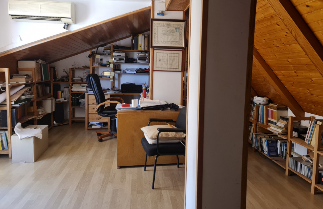 Мансарда закончена не полностью, поэтому можно обустроить ее по своему вкусу. А в законченной части оборудован кабинет, также есть терраса с прекрасным видом.