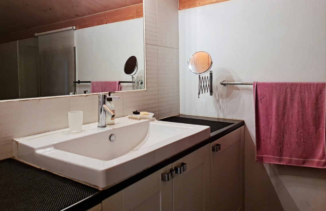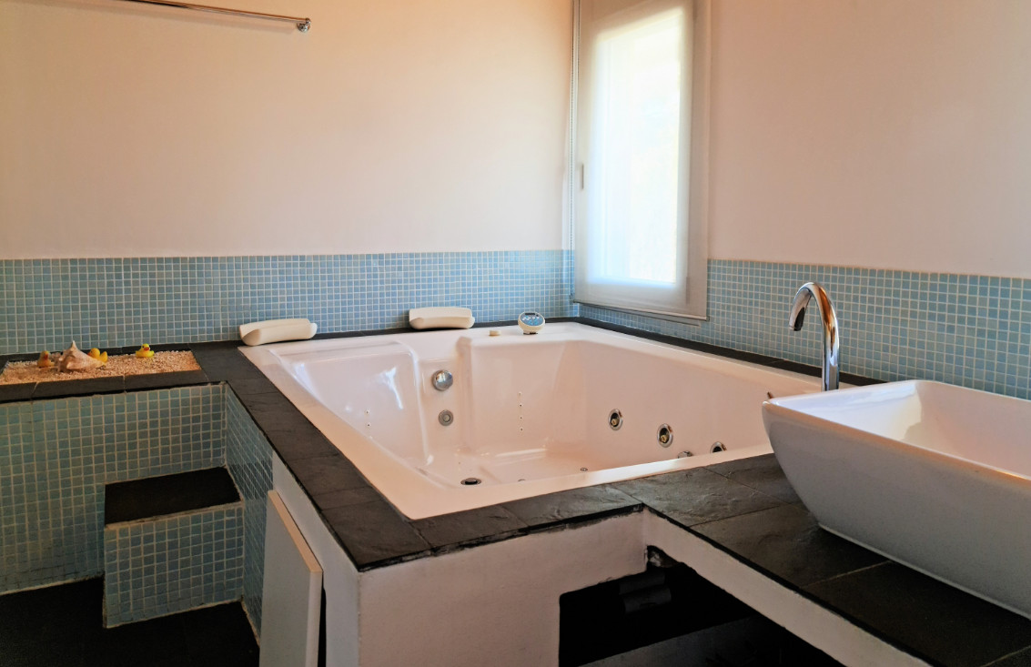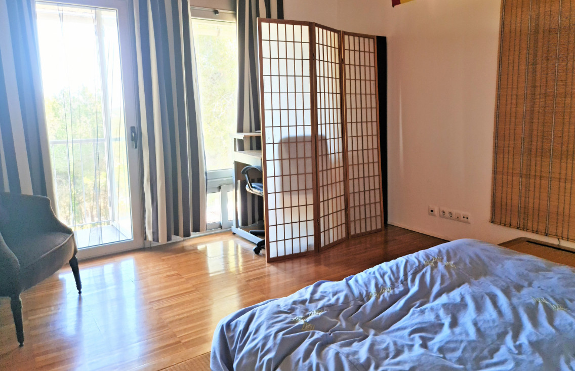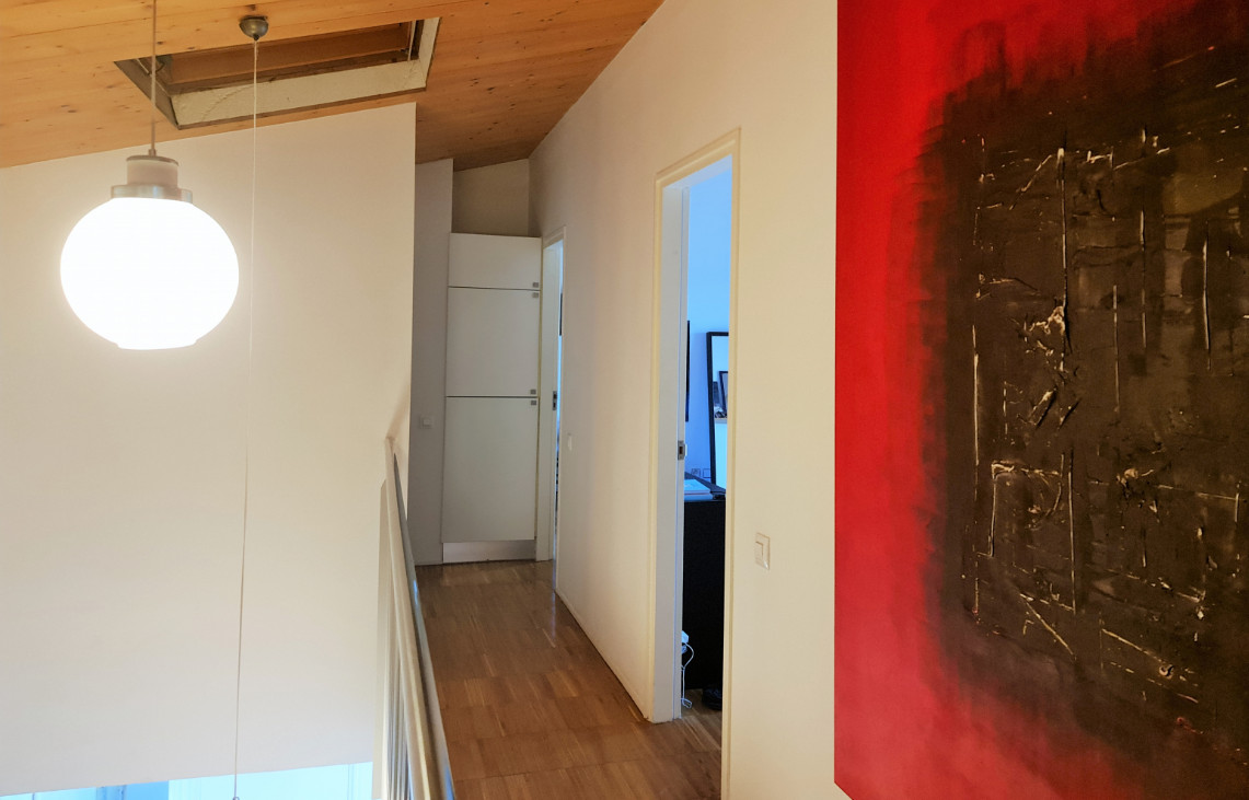 На этом же этаже туалет и красивая дизайнерская лестница, ведущая на второй этаж, где находятся три спальни, одна из которых с большой ванной комнатой с джакузи и гардеробной. Две другие спальни имеют общую ванную комнату. Из каждой комнаты открывается прекрасный вид.
