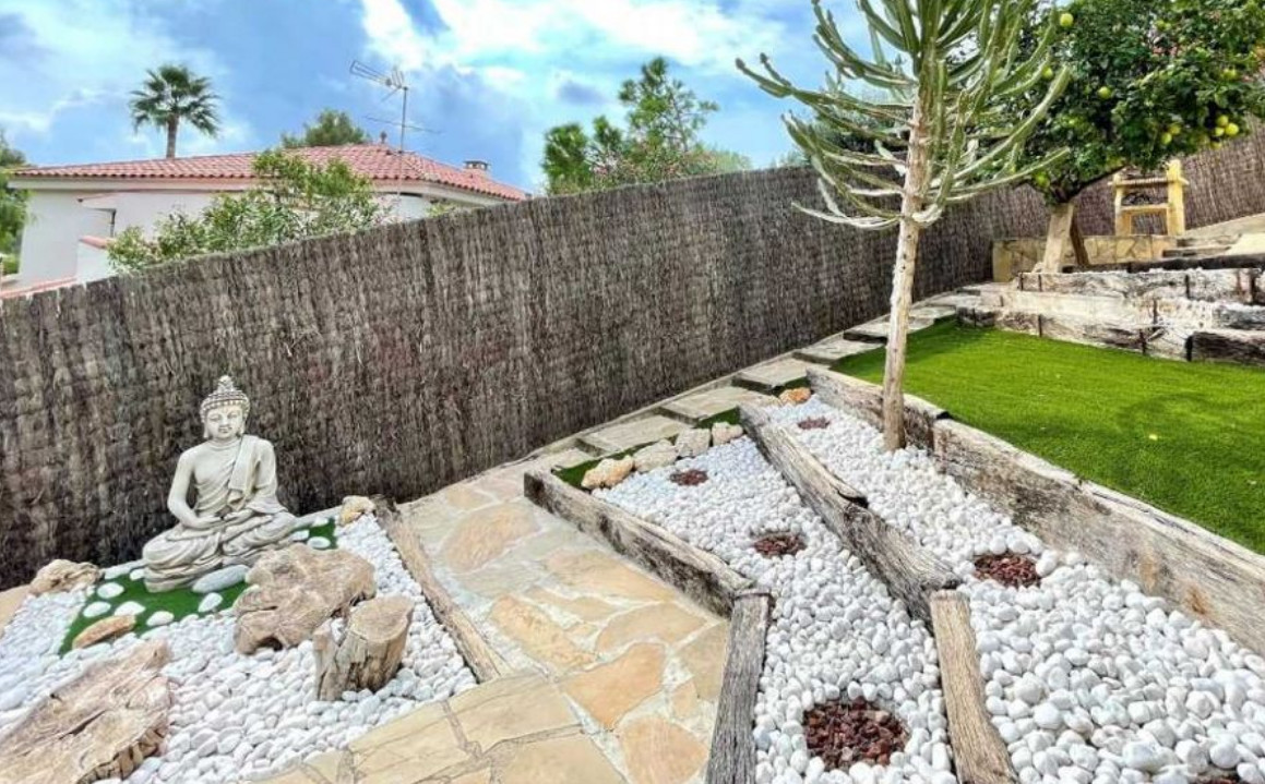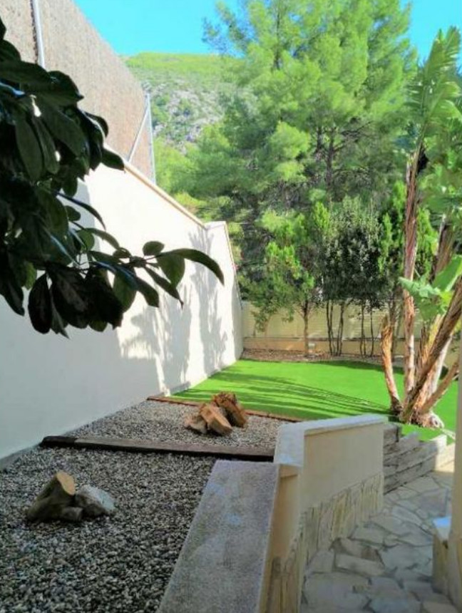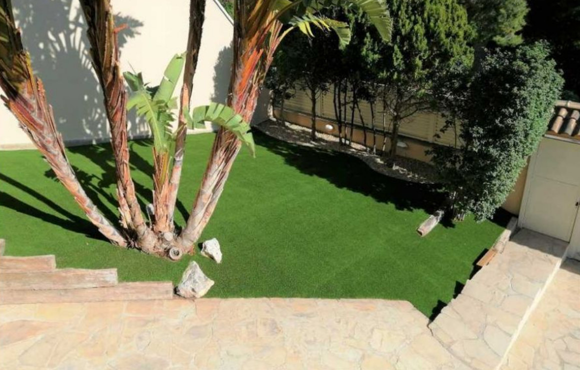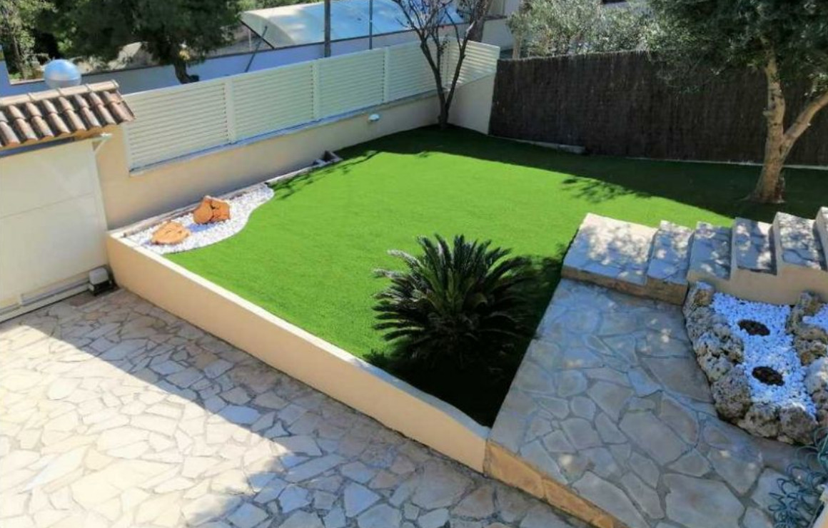 Участок рядом с домом площадью 614 м2. На этой территории красивый сад с различными деревьями и кустарниками. Сад не требует особого ухода, так как его окружает искусственная трава, натуральный камень и набивной цемент. Здесь также есть зона барбекю и достаточно места, чтобы при желании построить бассейн.