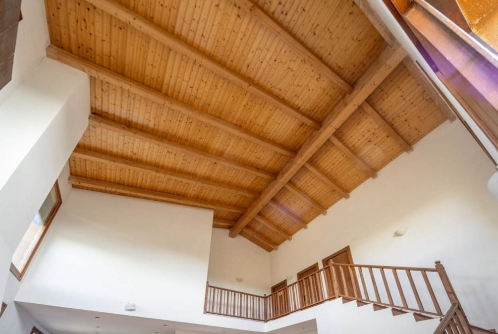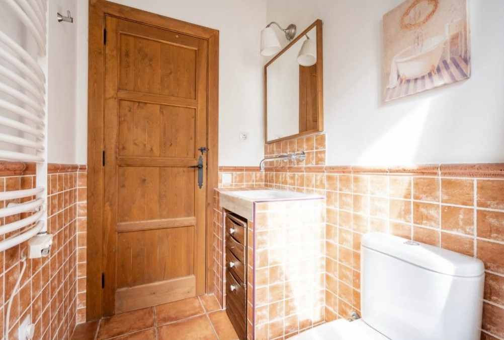 На первом этаже мы находим просторную и светлую столовую с камином и большую кухню в американском стиле, две спальни с двуспальными кроватями, ванную комнату и кладовую. На первом этаже у нас есть 3 спальни с двуспальными кроватями (одна из них с ванной комнатой с круглой ванной), а другая ванная комната с душем.