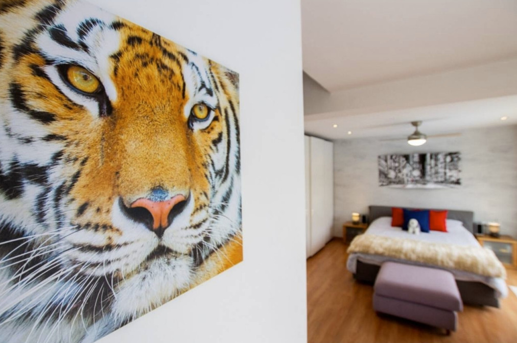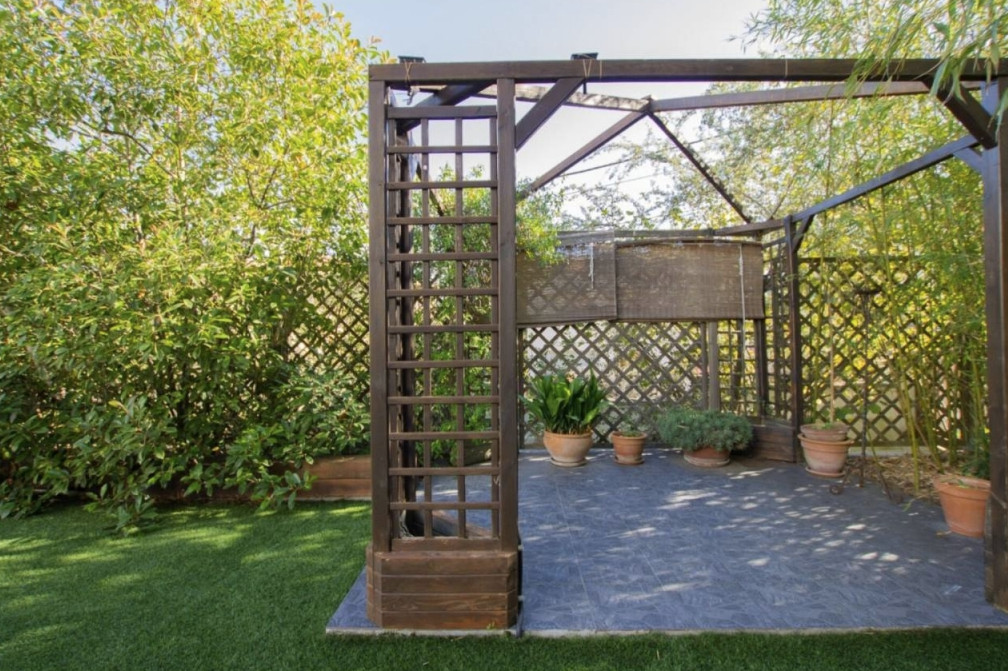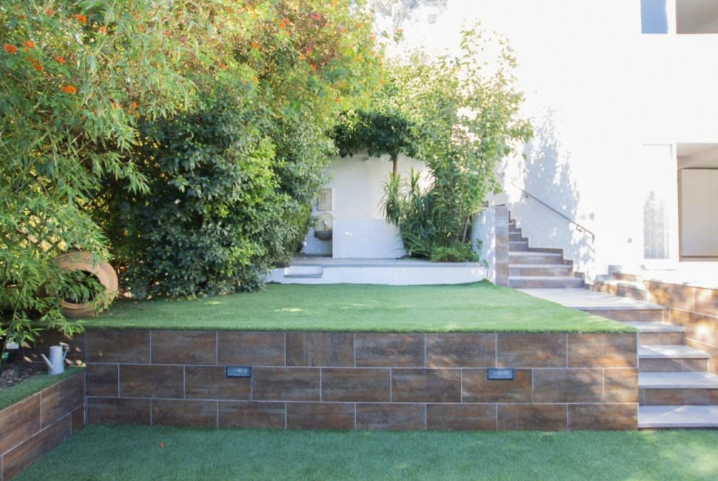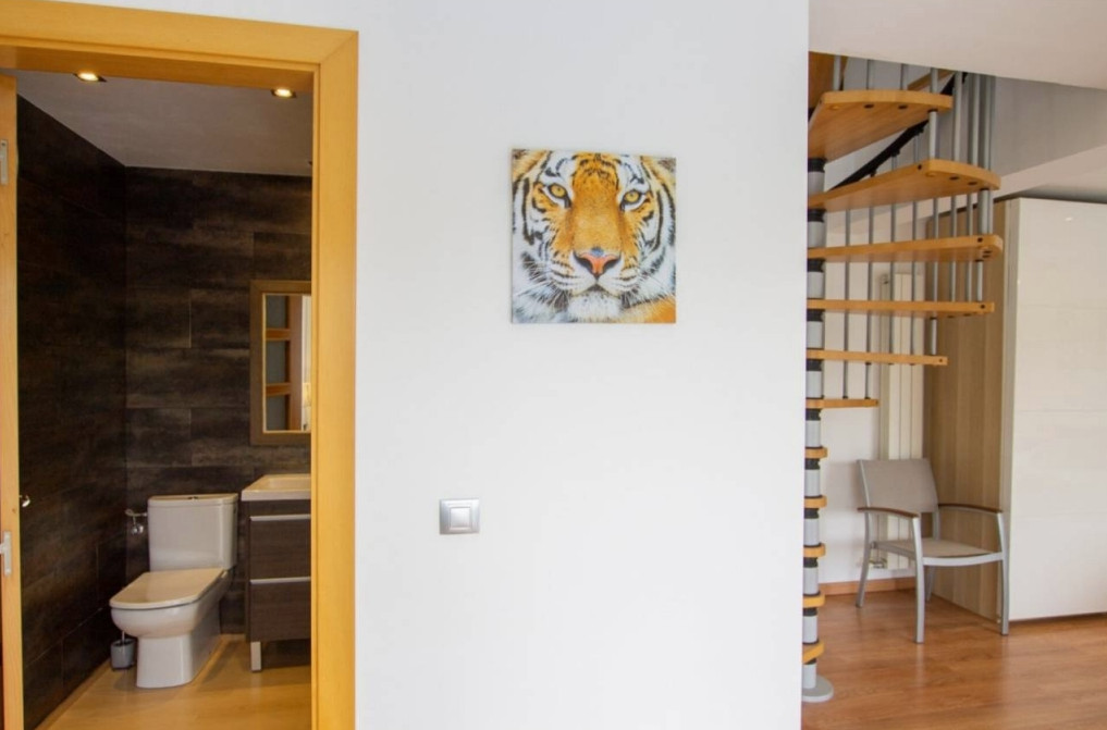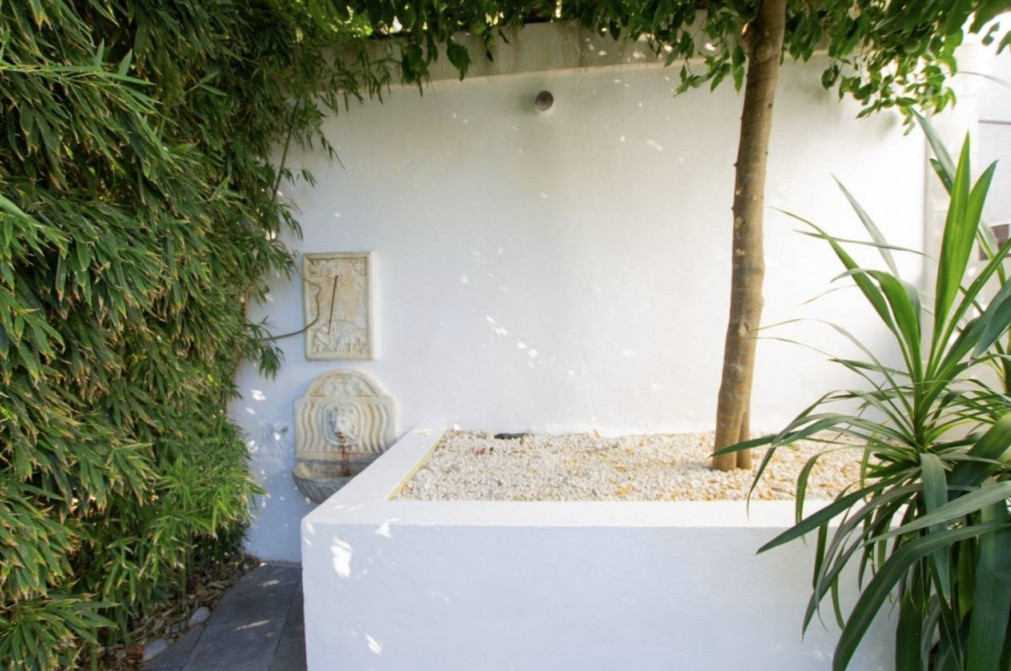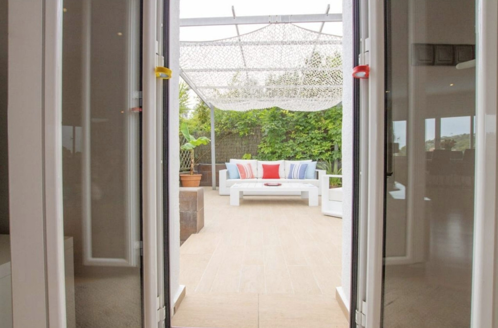 На первом этаже также есть ванная комната, передняя терраса и внутренняя винтовая лестница, ведущая на первый этаж, где мы найдем люкс площадью 60 м2 с ванной комнатой и прямым выходом к бассейну и саду. Внешний вид подготовлен к минимальному обслуживанию, с высококачественной искусственной травой и растительностью, которая обеспечивает большую конфиденциальность, автоматической системой орошения и перголой азиатского дизайна.