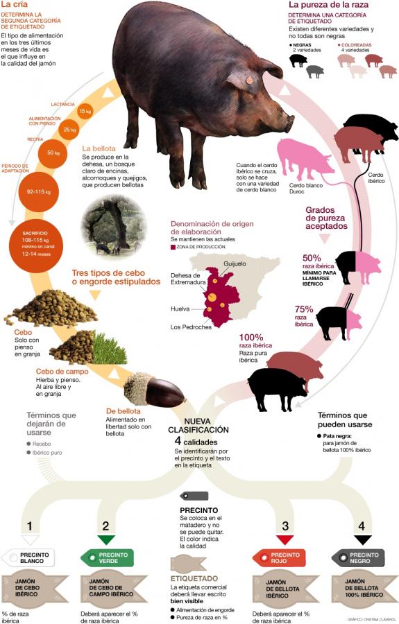 Хамон в Испании считают одним из фирменных деликатесов. Этим украшением национальной кухни гордятся фермеры, которые давно выращивают породу черных свиней для приготовления хамона. Посетить Испанию и не отведать изощренный вкус этого блюда, невозможно. Какой хамон выбрать к столу? Какой лучше привезти в подарок? Как читать цветные этикетки испанских производителей? Разберемся. В Испании существует сотни марок изысканного кушанья, однако все они маркируются и объединяются по цветам – в зависимости от способа выращивания свиней и приготовления. Испанские фермеры предпочитают выращивать свиней, следуя давним традициям, на просторных пастбищах. Вкусовые качества приготовленного мяса зависят, в основном, от рациона питания и климатических условий проживания хрюшек. По цвету этикеток можно определить, в какой провинции выросла и чем питалась свинья. Черная этикетка на хамоне Черная этикетка указывает на иберийскую породу, откормленную на пастбищах Испании в условиях сильной жары с низкой влажностью воздуха и в тени дубовых деревьев. Это 100% иберийские породистые свиньи. За и родословной и питанием следят не хуже чем за королевским. Питаются эти свиньи только желудями. Это самый дорогой, элитный хамон. Стоимость – от 150 евро за килограмм. С пометкой Reserva такой хамон может стоит и 500, и 600 евро за килограмм. Красная этикетка на хамоне Красный цвет при маркировке хамона подсказывает, что животное иметт не менее 75% генов иберийской свиньи. Остальные 25% могут принадлежать белой породе свиней. Питание таких свиней, как минимум, наполовину состоит из желудей, остальное – это свежий растительный корм. Хамон с красной этикеткой также обладает превосходными вкусовыми качествами и достоит подачи на самые презентабельные столы класса «премиум». Стоимость – от 85 евро за килограмм и до 200 евро, в зависимости от срока выдержки. Зеленая этикетка на хамоне Хамон из свиньи, которая питалась на пастбищах с подножным кормом, указывает зеленая этикетка. У этих свиней не менее 50% иберийской крови, остальные 50% - гены белой свиньи. Само мясо уже более розовое. В рацион кормления этой породы, помимо растительного корма и некоторой доли желудей добавляют уже фураж. Белая этикетка на хамоне Белый цвет означает, что свиньи выращивались на огороженной территории фермерского участка. Это самый доступный хамон по вполне демократичным ценам. Как правило, фермеры стараются, чтобы у свиней были какие-то гены иберийской свиньи ( хотя бы 10-20%), но по стандартам, этого не требуется. Инвесторам наверняка интересно, сколько же хамона того или иного вида производится в Испании, особенно, если учесть, что Испания занимает первое место по производству свинины в Европе и третье – в мире. Доля производства хамона в Испании по четырем видам показана на инфографике: Как прочитать этикетку? Первая цифра (на картинке это 05)указывает на номер забойщика.Печать ниже- его санитарный номер в реестре. Следующая цифра ( на картинке 2300 - номер партии). Цифра ниже - неделя и год убоя. Иногда указывается и вес свиньи во время убоя. Полезные ссылки (на испанском): хамон в картинках: Анабель Фелис Ещё о хамоне в Испании: Что такое Хамон? Как выбрать лучший хамон? ТОР-5 производителей национального деликатеса Как резать хамон: 10 советов Испания теперь продает и вегетарианский хамон Хамон в бан
