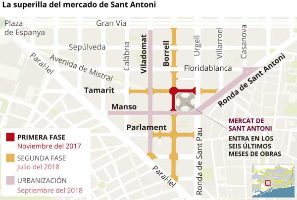 Район Sant Antoni станет следующим пространством, на которое распространится действие программы «supermanzanas». Данная стратегия была согласована Консисторией с жителями, представителями коммерческих и иных организаций района в феврале, чтобы исключить повторение опыта района Poblenou, где в середине января прошли демонстрации против «суперблоков». Кроме того, 87,2% жителей Побленоу, которым было предложено высказать свое отношение к инициативе властей в мае, отрицательно отнеслись к изменениям. По их мнению, в результате будет ограничено движение транспорта, но при этом не улучшается климат квартала. Учитывая негативный опыт в Poblenou, правительство Ады Колау применяет развертывание проекта в районе Сан-Антони, где дисбаланс будет иметь большее влияние, ввиду того, что в районе больше коммерческих объектов, выше уровень трафика и изобилия. Программа будет реализована в несколько этапов. В первую очередь планируется провести работы на слиянии улиц Tamarit и Comte de Borrell. В результате здесь появится большое общественное пространство. На втором этапе будет проведена реорганизация улиц Borrell (от Gran Via до Paral·lel) и Tamarit (до проспекта Mistral). Кроме того, параллельно будут вестись работы в коммерческой зоне. За 6 месяцев планируется восстановить почти 6000 м. кв. площадей старого торгового центра. Как отмечается, цель программы состоит в том, чтобы сделать улицу более комфортной для жителей, восстановить ее для социальных функций, общения, досуга, увеличить площадь общественных зеленых зон. Для реализации задуманного с учетом специфики района в процесс были также вовлечены организации собственников, представители коммерческих и прочих организаций. Два этапа Процесс изменений района предусматривает урбанизацию пространств: расширение пешеходных площадей, улучшение общественных зон. Эти работы планируется завершить в 2019 г. Основным направлением деятельности станет преобразование пространства в районе улиц Tamarit и la de Comte de Borrell, которое будет вестись в 2 этапа. Первый этап, который оценивается в 3,8 млн. евро, начнется в ноябре. Он предусматривает реорганизацию пространства в районе рынка Сан-Антони: Borrell, между Floridablanca, Manso и Tamarit, от Viladomat до Urgell. Как сообщается, улицы будут расширены за счет включения в общее пространство бывших рыночных площадей и территорий внутренних двориков. Как планируется, здесь будет организована единая платформа, где пространство будет поделено между велосипедистами и автомобилистами, а интенсивность движения снижена – скорость передвижения авто ограничат, а приоритет получат пешеходные маршруты. Проект предполагает также создание свободной пятиметровой площади перед фасадами зданий, которая будет дополнена полосой для зеленых насаждений и зон отдыха. Работы будут включать в себя и строительство площади на пересечении улиц Тамарит и Comte de Borrell, где будет запрещено автомобильное движение, за исключением местных жителей и автомобилей служб спасения, ЧС. Освещение и озеленение Второй этап будет осуществлен в Comte de Borrell, между Gran Via и Floridablanca, Tamarit, от Viladomat до Calàbria. На работы, которые завершатся в августе следующего года, будет затрачено 3,2 млн. евро. Работы будут вестись одновременно с выполнением последнего этапа работ по реконструкции рынка Sant Antoni, который предусматривает гидроизоляции участка наружной плиты первого этажа, укла