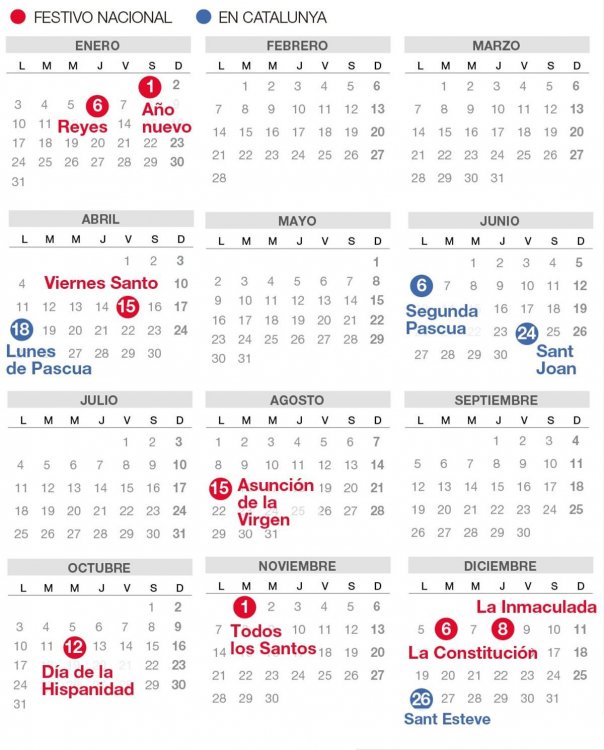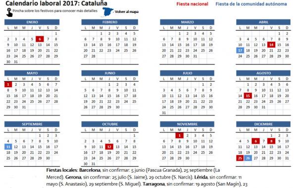 Вы уже начали планировать свой отдых в Испании? Не знаете. На когда покупать билеты. Когда открыты, а когда будут закрыты учреждения? Мы все это знаем, поэтому спешим с пылу-с жару опубликовать календарь на следующий год. Его утвердили всего три дня назад. Календарь находится под текстом, но тут нужно немножко объяснить, как это работает в Испании. В соответствии с испанским законом, устанавливается максимальное количество праздничных дней в году, а именно четырнадцать. Девять из них при этом являются общенациональными: 1 января - Epifanía del Señor 13 апреля - Jueves Santo, 14 апреля – Страстная Пятница (пасха) 1 мая - Fiesta del Trabajo 15 августа - Asunción de la Virgen 12 октября - Fiesta Nacional de España 1 ноября - Хеллоуин Día de todos Los Santos 6 декабря - Día de la Constitución Española 8 декабря - Inmaculada Concepción 25 декабря - Natividad del Señor Однако в том случае, если какой-либо из этих праздников приходятся на воскресенье, как и в 2017 году с Новым годом, то автономное сообщество имеет право перенести этот выходной на «прилегающий» день. Кроме того, так как Испании является федерацией, закон дает возможность автономным сообществам, чтобы расширить два других торжественных мероприятий, которые носят общенациональный характер: 6 января и 13 апреля (Святой четверг). Кроме общенациональных, не менее 7 праздничных дней устанавливают автономии, не менее двух – провинции и муниципалитеты. Все эти праздники, от общенациональных, до местных, должны приниматься во внимание при составлении трудовых календарей предприятий. Выходные дни в Каталонии (постановлении Правительства Каталонии) 17 апреля: Lunes de Pascua 11 сентября: Día de Cataluña 26 декабря: San Esteban Национальные праздники, а также те официальные выходные дни автономных сообществ публикуются соответствующими правительствами в официальных бюллетенях. Выходные дни (Постановления на уровне правительств провинции Каталонии) Барселона: 5 июня (pasqua de granada)26 сентября la Merce Жирона: 25 июля (Сан Хуан), 29 октября (Сан Нарцис) Таррагона: 19 августа (San Magin), 23 сентября (Santa Tecla) Лерида: 11 мая (Св. Анастасия), 29 сентября (Сан Мигель) Мы размещаем календарь, одобренный Правительством Испании и Каталонии для автономии, который. Однако, не включает в себя местные праздники провинциальных столиц и праздники муниципальных образований. Так как они должны быть приняты подписанием специального Постановления, праздники провинций указаны в трудовом календаре на 2017 год как «но конфирмадо» ("неподтвержденные"). Окончательный график праздничных дней принимается постановлением Правительства провинции и вашего города. Его можно будет получить в декабре в мэрии. Ещё о праздниках в Испании: Испанцы отмечают праздник весны. Первый и единственный фестиваль цветов и садов в Барселоне Пять лучших летних фестивалей Каталонии Праздник зеленого лука в Каталонии (Festa Calçotada) Необычные праздники Испании: День Девочек Праздники в марте в Каталонии (Испания) Ситжес в октябре: Фестиваль фильмов ужасов и блюда из мозгов для гостей Праздник анчоусов (XX Jornadas Gastronómicas de la Anchoa y el Suquet) Танец Смерти в каталонском Вергасе и Средневековые Мистерии во время Пасхи 6 января - Праздник Трех Королей в Испании (Богоявление) -