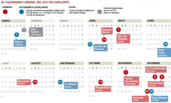 Женералитат Каталонии опубликовал календарь праздников на 2017. Уже известно, что на уровне государства и Автономии в следующем году испанцы будут отдыхать 13 дней, плюс еще два дня – это праздники локального уровня, которые устанавливаются местными органами власти Официальные праздники в Испании и Каталонии в 2017 году: 6 января (Трех Королей) 14 апреля ( Пасхальная пятница) 17 апреля (Пасхальный понедельник) 1 мая (День труда) 24 июня (San Juan, Сан Хуан) 15 августа (Успение) 11 сентября (День Каталонии) 12 октября (Национальный праздник Испании) 1 ноября (День всех святых) 6 декабря (День Конституции) 8 декабря (Непорочного зачатия) 25 декабря (Рождество) Декабрь 26 (Сан-Эстебан) Что касается оплаты рабочего времени, то Женералитат Каталонии обращает внимание, что официальные праздники являются оплачиваемыми и невозмещаемыми (т.е. нельзя у работника забрать этот день с тем, чтобы возместить в другое время).. Также особые указания касаются территории АРан, где праздник 26 декабря заменяется на 17 июня (день земли Аран). Это утверждено положениями Указа 152/1997 от 25 июня и указом 146/1998 от 23 июня, внесшего изменения в указ 177/1980 от 3-го октября. Четыре длинных уик-энда в 2017 году В Испании в 2017 году есть несколько дней, когда праздник приходится на пятницу или понедельник. Это День Королей (6 января), День труда (1 мая), Национальный день Каталонии (11 сентября) и Непорочного зачатия (8 декабря). В эти дни выходные удлиняются с помощью «пуэнтос», чтобы защитить одинаковые права работников которые работают в субботу, и тех, кто не работает. Местным властям рекомендовано решить вопрос и выработать рациональные решения вместе с профсоюзами, с тем, чтобы адаптировать ситуацию в соответствии с особенностями работы и содействовать удобству туристического сектора. Четыре «пуэнто», таким образом, образуются за счет выходных, а также сюда следует добавить четыре выходных дня, начиная от пасхальной пятницы до пасхального понедельника (14 апреля и 17 апреля соответственно). В 2016 многие муниципалитеты делали выходным также Страстной Четверг (Jueves Santo), что является правом муниципалитетов. Еще один «мостик» - это праздник Рождества и у Сан-Эстебан, которые в 2017 году придутся на понедельник и вторник. В целом календарь рабочих дней в 2017 году в Испании и Каталонии выглядит следующим образом: Ещё о праздниках в Испании: Испанцы отмечают праздник весны. Первый и единственный фестиваль цветов и садов в Барселоне Пять лучших летних фестивалей Каталонии Праздник зеленого лука в Каталонии (Festa Calçotada) Необычные праздники Испании: День Девочек Праздники в марте в Каталонии (Испания) Ситжес в октябре: Фестиваль фильмов ужасов и блюда из мозгов для гостей Праздник анчоусов (XX Jornadas Gastronómicas de la Anchoa y el Suquet) -