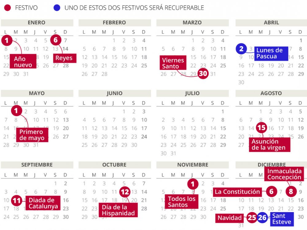 Календарь праздничных дней меняется в Испании каждый год. Национальные и региональные праздники определяются Министерством труда с учетом того, на какую дату и какой день недели они выпадают. В этот раз Каталония будет отмечать в общей сложности 14 государственных праздников. Как, впрочем, и в прошлом году. Официальный вестник BOE уже опубликовал производственный календарь на предстоящий год для всех провинций Каталонии (Барселона, Жирона, Льейда и Таррагона). Национальные государственные праздники Испании устанавливает центральное правительство. В этом году их будет 9. Остальные определяются автономными сообществами и местными муниципалитетами. Например, в Барселоне, Льейде, Реусе, Таррагоне, Жироне и Ситжесе, количество праздничных дней, как правило, не совпадает. Стоит иметь в виду, что законодательно закрепленный производственный календарь является общеобязательным как для работников частных и государственных компаний, так и для служащих. Индивидуальные предприниматели, разумеется, более свободны в выборе рабочего графика. Кроме того, каждый трудовой коллектив может иметь свое собственное коллективное соглашение, предусматривающие дополнительные выходные. В любом случае, работодатель может только увеличить количество нерабочих дней, установленных правительством. Одним из важнейших в календаре «плавающих» праздников является Пасха. Зная точную дату этого знакового праздника, испанцы уже в январе планируют свои весенние каникулы, перенося рабочие дни и продлевая нерабочую неделю еще на несколько дней, так называемый «мост». В этом году Страстная неделя в Испании пройдет со 2 апреля (Вербное воскресенье) по 9 апреля (Воскресение Христово). Однако отработать каталонцам придется почти всю неделю. Великий (Чистый) четверг не является праздничным днем в автономии, поэтому каникулы начнутся только в пятницу, 7 апреля. Нерабочим будет и понедельник 10 апреля, что позволит удлинить праздничную неделю еще на один день (тот самый «мост»). Национальные праздники Испании, общие для всех автономий страны: 6 января - Богоявление 7 апреля - Великая (Страстная) пятница 1 мая - Праздник труда 15 августа - Вознесение Богородицы 12 октября - Испанидад (день испаноязычного населения) 1 ноября - День всех святых 6 декабря - День Конституции 8 декабря - Непорочное зачатие 25 декабря - Рождество Региональные праздники Каталонии в 2023 году: 10 апреля - Пасхальный понедельник 24 июня - Сан-Хуан (Иванов день) 11 сентября - День Каталонии 26 декабря - Сан-Эстебан Следует обязательно учитывать местные праздники каждого города и муниципалитета, которые отмечают исключительно в этом населенном пункте. В Барселоне, например, в 2023 году это: 29 мая - День Святой Троицы (Пятидесятница) 25 сентября - Праздник Ла Мерсе (Богородица Вирхен-де-ла-Мерсе, покровительница Барселоны) Календарь праздников Каталонии в 2023 году по месяцам (с учетом национальных и региональных праздников): Январь: 6.01.23 (пт) Февраль: нет Март: нет. Апрель: 7.04.23 (пт) 10.04.23 (пн) Май: 1.05.23 (пн) 29.05.23 (пн), Барселона Июнь: 24.06.23 (сб) Июль: нет. Август: 15.08.23 (вт) Сентябрь: 11.09.23 (пн) 25.09.23 (пн), Барселона Октябрь: 12.10.23 (чт). Ноябрь 2023: 1.11.23 (ср). Декабрь 2023: 6.12.23 (ср) и 8.12.23 (пт), составят первый декабрьский перенос праздников 25.12.23 (пн) 26.12.23 (вт) подарят каталонцам второй декабрьский «мост». Ещё о праздниках в Испании: Необычные праздн