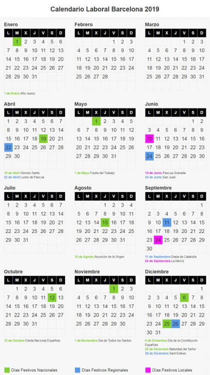 В Испании в 2019 году предусмотрено 14 праздников. Причем 2019 год будет включать в себя 12 региональных каталонских или национальных праздников, а городские советы добавляют еще два выходных дня, которые являются официальными оплачиваемыми выходными. Общие региональные и национальные праздники в 2019 году: 1 января (конец года) 19 апреля (Страстная пятница) 22 апреля (понедельник Пасха Флориде) 1 мая (День труда) 24 июня (Сан-Хуан) 15 августа (Успение) 11 сентября (Национальный фестиваль Каталонии) 12 октября (Национальный праздник Испании) 1 ноября (Всех Святых) 6 декабря (День Конституции) 25 декабря (Рождество) 26 декабря (Сан-Эстебан) Скачать: Calendario Laboral Barcelona 2019 Для провинций Каталонии: Посмотреть календарь 2019 Жирона Календарь 2019 Таррагона Календарь 2019 Лерида Ещё о праздниках в Испании: Танец Смерти в каталонском Вергасе и Средневековые Мистерии во время Пасхи Пять лучших летних фестивалей Каталонии Праздник зеленого лука в Каталонии (Festa Calçotada) Необычные праздники Испании: День Девочек Праздники в марте в Каталонии (Испания) Сладкая Барселона. Праздник Sant Medir и его легенды Весёлые праздники Испании: Каталонская ярмарка овец в Риполе Испанцы отмечают праздник весны. Первый и единственный фестиваль цветов и садов в Барселоне -