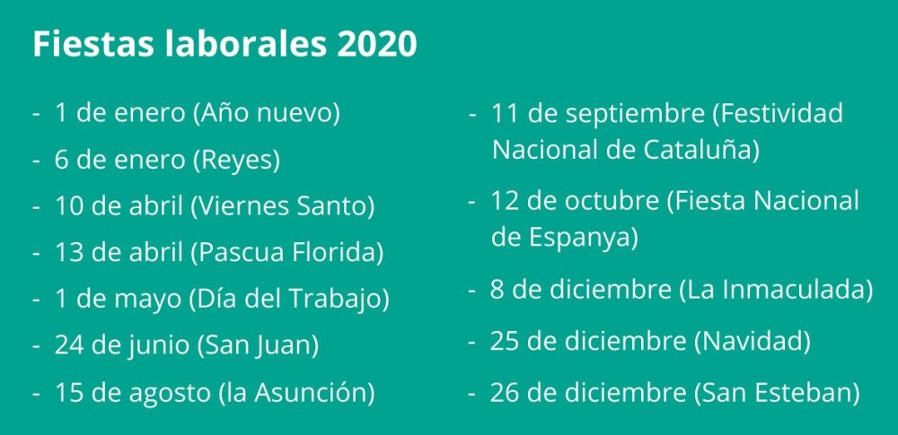 В Испании в 2020 году предусмотрено 14 праздников. Причем 2020 год будет включать в себя 12 региональных каталонских или национальных праздников, а городские советы добавляют еще два выходных дня, которые являются официальными оплачиваемыми выходными. Общие региональные и национальные праздники в 2020 году: 1 января (конец года) 10 апреля (Страстная пятница) 13 апреля (понедельник Пасха Флориде) 1 мая (День труда) 24 июня (Сан-Хуан) 15 августа (Успение) 11 сентября (Национальный фестиваль Каталонии) 12 октября (Национальный праздник Испании) 1 ноября (Всех Святых) 6 декабря (День Конституции) 8 декабря 25 декабря (Рождество) 26 декабря (Сан-Эстебан) Скачать: Calendario Laboral Barcelona 2020 Для провинций Каталонии: Посмотреть календарь 2020 Жирона Календарь 2020 Таррагона Календарь 2020 Лерида Ещё о праздниках в Испании: Танец Смерти в каталонском Вергасе и Средневековые Мистерии во время Пасхи Пять лучших летних фестивалей Каталонии Праздник зеленого лука в Каталонии (Festa Calçotada) Необычные праздники Испании: День Девочек Праздники в марте в Каталонии (Испания) Сладкая Барселона. Праздник Sant Medir и его легенды Весёлые праздники Испании: Каталонская ярмарка овец в Риполе Испанцы отмечают праздник весны. Первый и единственный фестиваль цветов и садов в Барселоне -