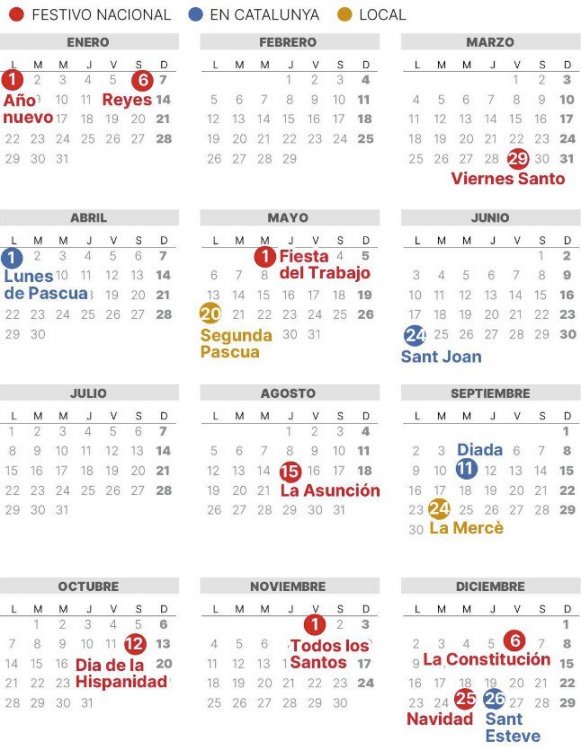 На 2022 год в Каталонии запланировано 14 праздничных дней. К 12 официальным праздникам добавляют ещё два местных. 1 января (суббота): Новый год 6 января (четверг): праздник Трёх Волхвов 15 апреля: Страстная пятница 18 апреля: Пасха 6 июня: «Вторая Пасха» 24 июня (пятница): Сан-Хуан 15 августа (понедельник): праздник Вознесения Девы Марии (Asunción) 12 октября (среда): Национальный фестиваль Испании 1 ноября (вторник): День Всех Святых 6 декабря (вторник): День Конституции 8 декабря (четверг): Торжество Непорочного зачатия Девы Марии 26 декабря (понедельник): День Святого Стефана Остальные два праздничных дня муниципалитеты выбирают на своё усмотрение. Ещё о праздниках в Испании: В Барселоне начинается празднование Дня Святой Евлалии Ла Мерсе - Дни города в Барселоне пройдут уже в эти выходные Фестиваль La Mercè в Барселоне празднует свое 150-летие Необычные праздники Испании: День Девочек Праздники в марте в Каталонии (Испания) Сладкая Барселона. Праздник Sant Medir и его легенды Танец Смерти в каталонском Вергасе и Средневековые Мистерии во время Пасхи Пять лучших летних фестивалей Каталонии Праздник зеленого лука в Каталонии (Festa Calçotada) Весёлые праздники Испании: Каталонская ярмарка овец в Риполе Испанцы отмечают праздник весны. Первый и единственный фестиваль цветов и садов в Барселоне-