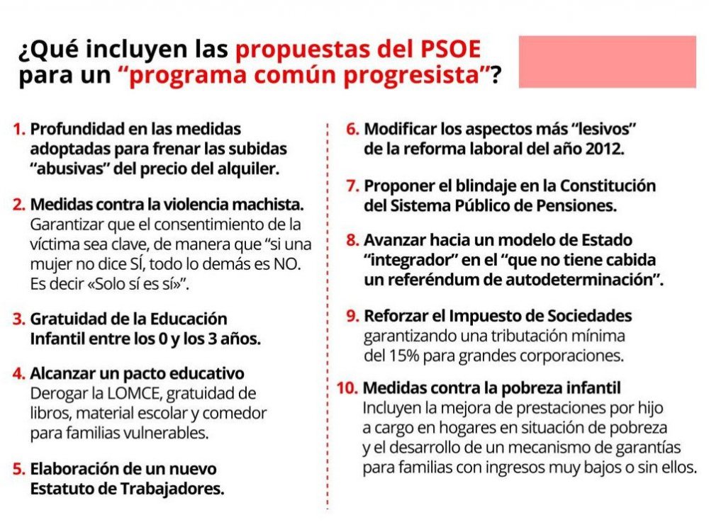 Это вторая часть статьи. В первой мы говорили о планируемых реформах нового Правительства Испании в сфере налогообложения, занятости и трудоустройства, пенсий, прав трудящихся, гарантированном доходе для проживающих в Испании и о реформах для индивидуальных предпринимателей. Сегодня мы рассмотрим остальные пункты программы партии социалистов Испании (PSOE). Те, кто глубоко интересуется вопросом, может в конце статьи найти ссылку, по которой можно перейти на 152-страничный буклет с детальным изложением программы. P-S- Вещь скучная, но все же лучше жить с открытыми глазами, хоть немного понимая, что именно будет меняться в стране. 8. Семья в Испании – больше защищенности Новое правительство Испании обещает сделать равными льготы для отца и матери ребенка. Отпуск по отцовству будет постепенно возрастать до 16 недель в течение следующих 3 лет, что соответствует материнскому декретному отпуску. Отпуска для семьи с одним родителем увеличиваются до 18 недель. Кроме того, PSOE обещает рационализацию графиков работы (предоставить права) для совместной ответственности партнеров (трудового и семейного). Также социалисты собираются пересмотреть понятия многодетной семьи и семьи с одним ребёнком со специальным статусом (особая защищенность). Это семьи с четырьмя и более детьми, а в случае с одиноким родителем – от двух детей. Льготы для семьи с одним родителям с двумя детьми приравняют к льготам многодетной семьи. 9. Образование - пересмотр системы Верта LOMCE Санчес считает образование одним из самых главных пунктов своей программы. Ни много ни мало, но он заявил, что собирается в течение 8 лет сделать испанское образование лучшим в Европе и направлять на это 7% национального бюджета. PSOE хочет продвигать новый Основной закон об образовании, «который отменяет LOMCE и его негативные последствия, который защищает государственное образование как основу системы образования и включает в себя соглашения, достигнутые образовательным сообществом в эти годы» и возвращает инвестиции в образование в 5% ВВП в 2025 году, далее – 7%. Вот некоторые из пунктов: Предоставляет бесплатное первое зачисление в университет по специальностям STEM (наука, технология, инженерия и математика) для девочек, когда на выбранную профессию в среднем приходится менее 30% учащихся женского пола. Стипендии для обучения. Одним из основных пунктов реформы образования правительства Санчеса является (и была) система стипендий, которую отменил Рахой. Социалисты хотят вернуть систему с точки зрения субъективного права, связанного с уровнем дохода семей. Кроме того, они хотят ускорить и упростить систему, чтобы сделать ее более прозрачной и предсказуемой, с тем, чтобы учащийся и его семьи знали еще в начале курса, могут ли они рассчитывать на этисуммы. Разумеется, в рамках общих государственных бюджетов объявляется об увеличении финансирования стипендий и учебных пособий, в то время как для лиц, оказавшихся в неблагоприятных социально-экономических условиях, социалисты требуют полное бесплатное обучение с учетом оплаты книг и учебных материалов, а также питания в школьных столовых. Улучшение финансирования и повышения уровня программы MIR для врачей. 10. Коррупция PSOE предоставляет закон против налогового мошенничества для предотвращения и борьбы с «новыми формами уклонения». Кроме того, 