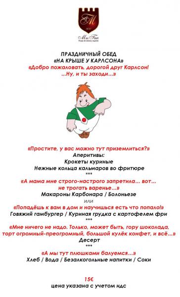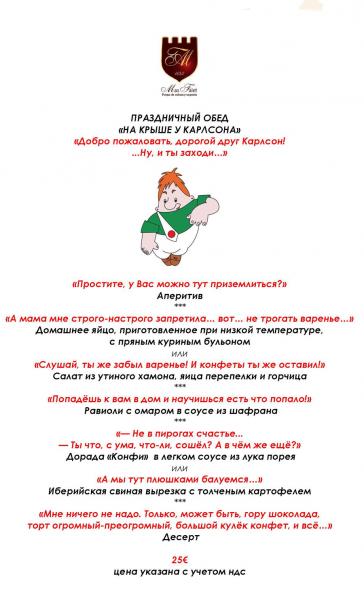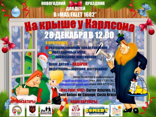 ДОН-ДИЛИ-ДОН ДИЛИ-ДОН ДИЛИ-ДОН! НОВОГОДНИЙ ПЕРЕЗВОН! 28 ДЕКАБРЯ! ПРИХОДИТЕ САМИ И ПРИГЛАШАЙТЕ ДРУЗЕЙ! Приглашаем мальчишек и девчонок, а также их родителей на новогодний праздник «На крыше у Карлсона». Мы ждем вас 28 декабря в 12.00 в «Mas Falet 1682» (сarrer Asturies, 11, Sant Antoni de Calonge, 17252, Girona, COSTA BRAVA). В программе праздника: - театрализованное представление, игры, песни, танцы вокруг елки, и, конечно, подарки! Лучшим артистам (певцам, чтецам стихов, танцорам) и обладателям лучших новогодних костюмов – призы от Дедушки Мороза и наших друзей. (цена билета: детский (с подарком) - 15€, взрослый - 10€); - праздничный обед (специальное праздничное меню от шеф-повара ресторана «Mas Falet 1682»: детское – 15€, взрослое – 25€. Заказ столиков: тел. 972 66 27 26. Предварительное бронирование обязательно!) Новогоднее меню 2015: Детское Взрослое - детская новогодняя мастерская: изготовление елочных украшений и новогоднего декора из природных материалов и войлока (цена билета: 15€, материалы включены в стоимость билета, для детей от 6 лет) Приобретайте билеты на елку и заказывайте столики в ресторане заранее - до 20 декабря! Продажа билетов и дополнительная информация: - olga@masfalet.com (тел. 693 77 55 78), - radugabcn@gmail.com (тел. 669 97 75 42) ОРГАНИЗАТОРЫ: Ассоциация и русская школа «Радуга» и Культурно-деловой парк «Mas Falet 1682» Carrer Asturies, 11 · Sant Antoni de Calonge, 17252 · Girona (Costa Brava) Официальный сайт: www.masfalet.com Схема проезда P.S. ДОРОГИЕ РОДИТЕЛИ! Возможно, среди вас есть такие, которые хотели бы дополнительно поздравить детей – согласно вашему роду деятельности, увлечениям, просто движениям души. Мы, организаторы, очень даже не против! Например, вы можете снять и смонтировать фильм про наш праздник, или отлично фотографируете и можете сделать итоговый электронный фотоальбом, или вы можете подарить каждому ребенку по новогоднему колпаку (просто так), или вручите несколько замечательных призов – за лучший танец, стих или песню. Позвоните/напишите нам – и мы с благодарностью обсудим такие возможности. ДО ВСТРЕЧИ! Новый год в Испании, все праздники читайте здесь. Желаем Вам весело провести Новый год в Барселоне! Возможно, Вам будет интересно: Новый год в Барселоне: как попасть в дом Деда Мороза? Новый год и рождественские праздники для детей в Паламосе (Коста Брава, Испания) Новый год в Барселоне, впечатления о поездке Новогодний каток в Жироне! Новый год в Испании 2015: новогодний каток на Коста Брава (Палафружель) Рождественский русско-каталанский концерт в Барселоне. 18 декабря 2014 Русская новогодняя елка в Барселоне 2014/2015 Новогодний праздник в Барселоне "Проказы Волка в царстве Деда Мороза" 21 декабря 2014 Новогодний праздник " В гостях у Карлсона", замок Mas Falet, Коста Брава Рождество в Испании: программа от Порт Авентура Новый год в Порт Авентура 2015 теги: mas falet, коста брава, новый год в испании, новый год в испании 2015, отдых в испании с детьми, отдых в испании, провести новый год, новый год в европе, где провести новогоднюю ночь, новый год для детей, отдых с детьми новый год-