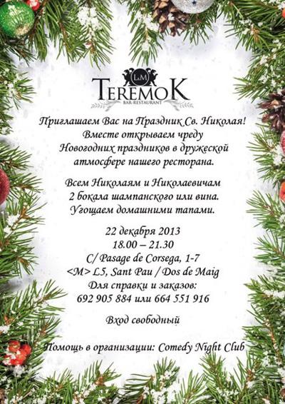 Ресторан «Теремок» приглашает всех желающих на праздничный вечер в бесплатными тапами, чтобы отметить праздник в отеческой дружественной обстановке. Вечер посвящен дню Св. Николая. Всем Николаям вино и шампанское бесплатно))) Место и время указано на афише. Проведи весело Новый год в Барселоне! Материалы по теме: Новогодний «Камеди Клаб» в Барселоне Новый Год в Tablao de Carmen План мероприятий в Каталонии на Новый Год и Рождественские праздники Новый Год в Poble Espanyol Новый Год в отеле Murmuri Барселона зажигает рождественскую иллюминацию Ресторан Alkimia* (Барселона, звезды Мишлен) Новый Год в 5* Отеле Palace теги: новогодний вечер для взрослых, новый год в испании, испания в декабре, новый год в испании 2014, рождество в испании, новый год в барселоне, новый год в ресторане, новый год 2014 в ресторане, вечер для взрослых, день св николая- 1 ответ