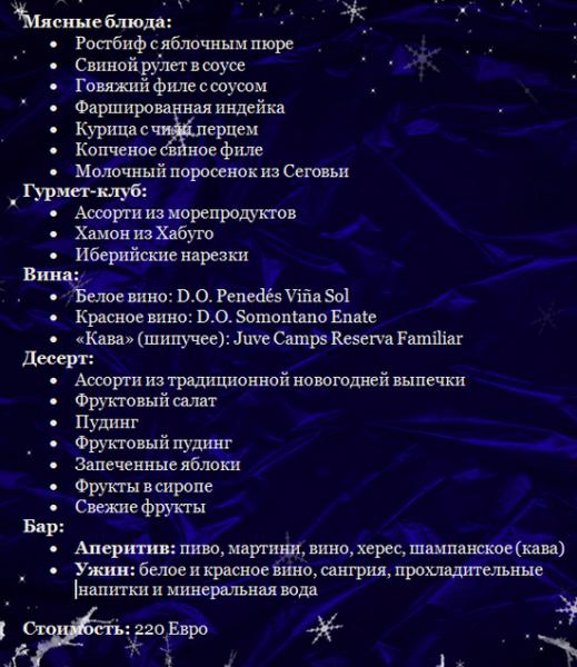 Многие-многие, живущие в Испании, мечтают встретить Новый год по-русски. Испанские рестораны в 00.30 уже закрыты. Испанцы выпивают в 00.00 шампанское, быстро съедают 12 виноградин - и уже через 15 минут все расходятся. Скукота! Так что у нас появилась и вправду уникальная возможность встретить Новый год в ресторане по-русски: с боем курантов, с русским караоке, с Дедом Морозом и Снегурочкой. Срочно звоните в ресторан "Медитеррани" - делайте предоплату,записывайтесь на самый веселый праздник года! Уже записалось 25 человек. Вместиться могут 50 Плюсы: все любимые с детства блюда на одном столе. Вам дома столько не приготовить! веселая компания вы познакомитесь с новыми людьми - к нам приезжают русскоязычные предприниматели из разных городов Каталонии вам будет весело вы покажете детям, как отмечается наш Новый год Хозяйка щедро накрывает стол, работает система "все включено", но чтобы вот такой объем подготовить, надо знать сколько людей будет. Приезжайте из Барселоны, Ллорет де Мар, из Таррагоны и Тоссы. И не только русские - все русскоязычные! Ведь в меню будут и русские, и армянские, и украинские блюда, программа для взрослых и аниматоры для детей. А вот это уже будет интересно мужчинам: У ресторана есть сзади еще и дворик в стиле "немецкого " Beargarten", где можно курить, общаться "за пределами зала" Вопрос: а что будет? программа, меню. сколько это стоит? Эвелина: Новогоднее меню можно посмотреть внизу объявления. Предусмотрена Новогодняя программа - будем водить хоровод вокруг елки, принимать поздравления от Деда Мороза и Снегурочки. Под бой курантов загадаем желания. Цена Меню с Новогодней программой - 65 Евро.( предоплата до 22 декабря 2015 года). для детей - 35 евро. В случае оплаты до 22 декабря - 65 евро с человека. И Если Вы решите присоединиться к нам 31 декабря 2015 - цена Новогодней программы вместе с Меню будет стоить уже 75 Евро на взрослого. Вопрос: А что, если кому-то хочется встретить Новый Год дома, а только потом прийти в ресторан? Эвелина: Приходите. будем рады. Но в этом случае для гостей без пригласительного будет обслуживание не по "all inclusive", а по карте ресторана (меню). До скольки ресторан будет открыт? Эвелина: До последнего клиента. Более того - мы ценим наших мужчин. Для желающих продлить удовольствие от Нового Года "до победного конца" - предлагаем утром в 6 часов ХАШ под водочку ( это блюдо выбирали целое лето наши клиента именно как хороший сытный опохмел) Цена такого пригласительного тогда увеличится на 10 евро. А если мы будем гулять дома, но хотим прийти на ХАШ и догулять? Эвелина: Для тех, кто присоединится к нам после 00-00 31 декабря 2015 года ХАШ под водочку будет стоить 20 Евро Есть ли какие-то скидки для участия в празднике? Эвелина: для членов русского семейного клуба - 10% на группы от 10 человек -10%. Куда обращаться? Как купить пригласительный? Эвелина : К хозяйке, конечно! И на все ваши вопросы отвечу! И расскажу как иногородним записаться. +34680241108(Испания) viber +34680241108 whatsapp +34680241108 surviento@bk.ru Ресторан находится на главной улице города, сразу слева от "Бургер Кинга". Парковка вокруг бесплатная Новогоднее меню с программой в ресторане "Медитеррани" *система "все включено" САЛАТЫ Салат «Оливье по-русски» от Мороза Селедочка под шубой от Лешего Винегрет от Курочки-Рябы Салат «Цезарь» от Кикиморы Салат «Мимоза» от Снегурочки ХОЛОДНЫЕ ЗАКУСКИ Паштет из куриной печен