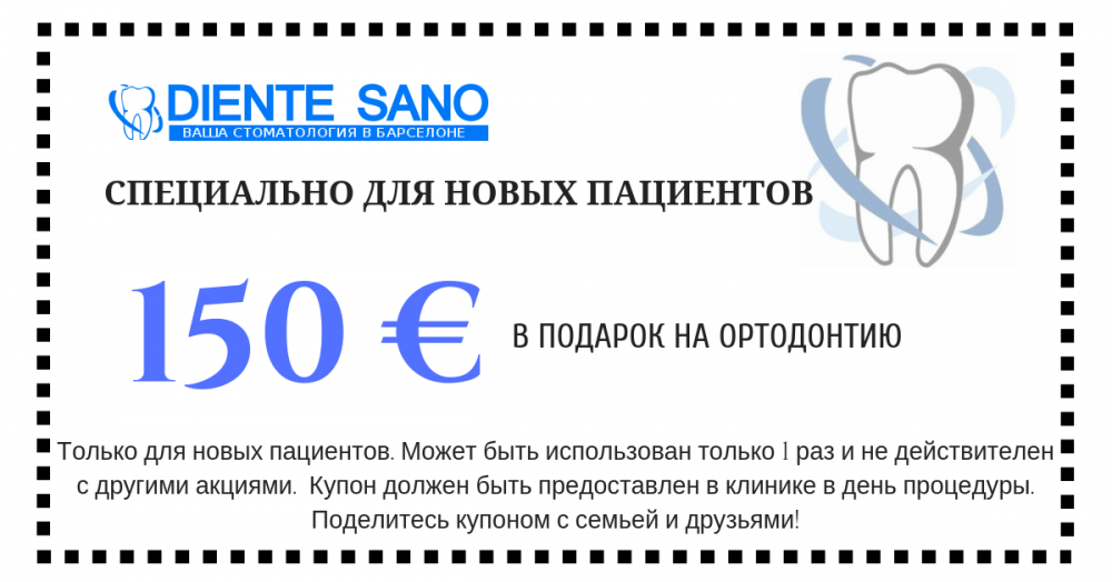 Давно мечтаете исправить прикус? У Diente Sano для вас специальное предложение. Получите 150 евро на ортодонтическое лечение в подарок, просто показав этот купон в клинике! Не забудьте, что первая консультация со специалистом абсолютно бесплатна и без компромиссов. Сделайте первый шаг на встречу здоровой и красивой улыбке, запишитесь на прием 633312126 (WhatsApp)-